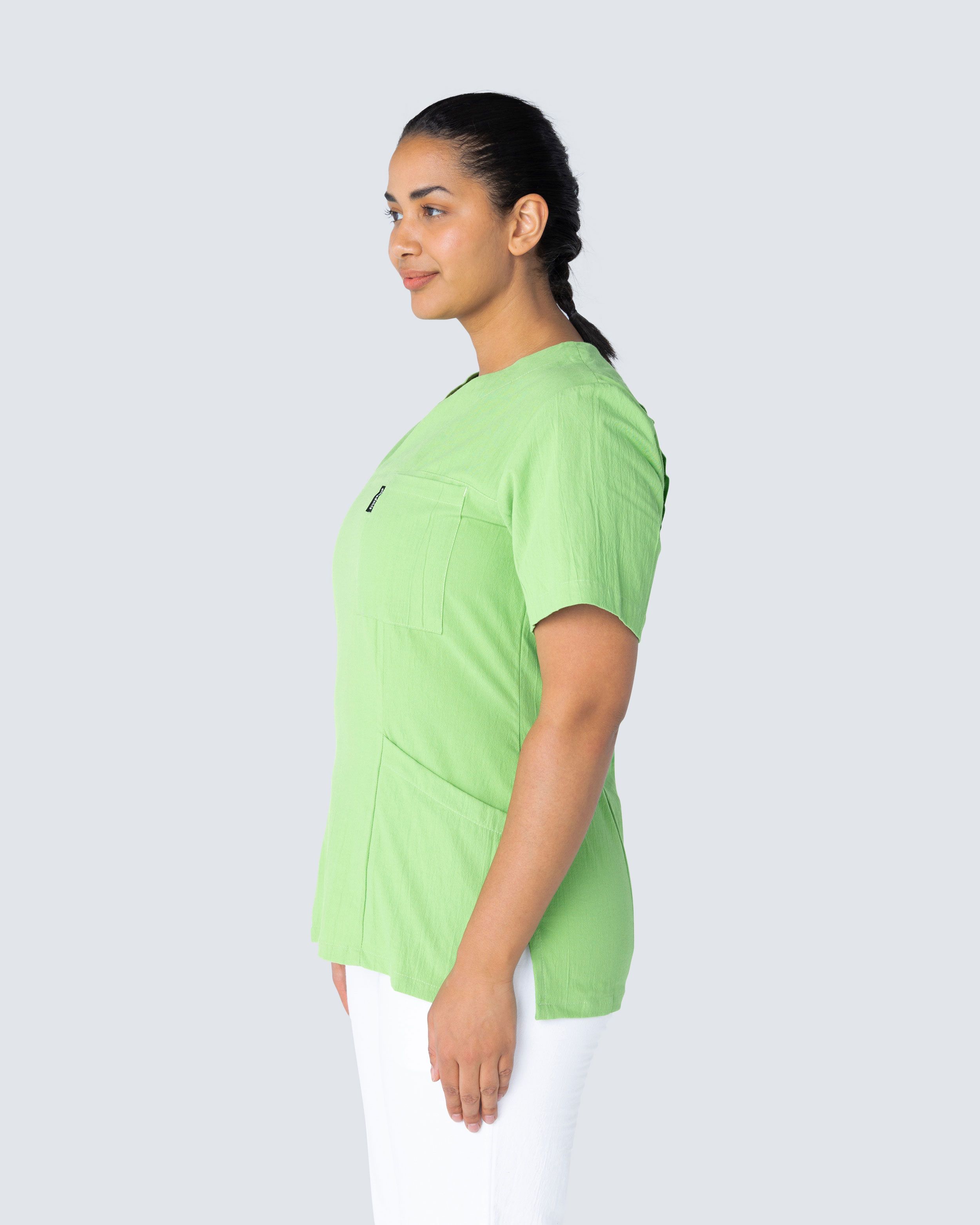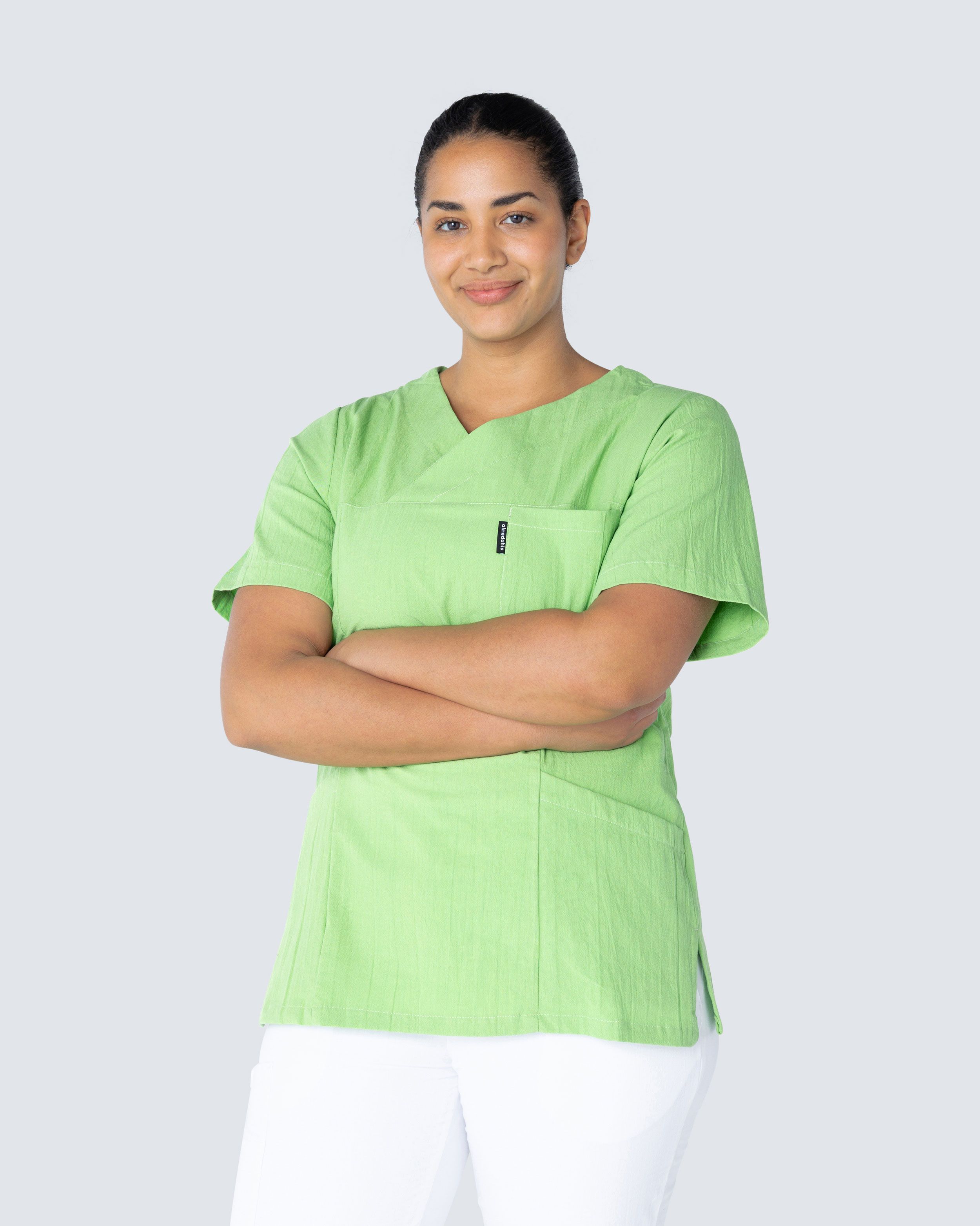 Kittel i kriklet bomull som gir en lett og sval følelse. Den kriklete bomullen krever minimalt med skjøtsel, så som styking. Kitlen har v-hals og er lett innsvingt i modellen, hvilket gir den en fin silhuett og passform. Med både brystlomme og to hoftelommer med mobillomme og nøkkelhank har du godt med plass for diverse arbeidsutstyr og artikler du trenger under en arbeidsdag.