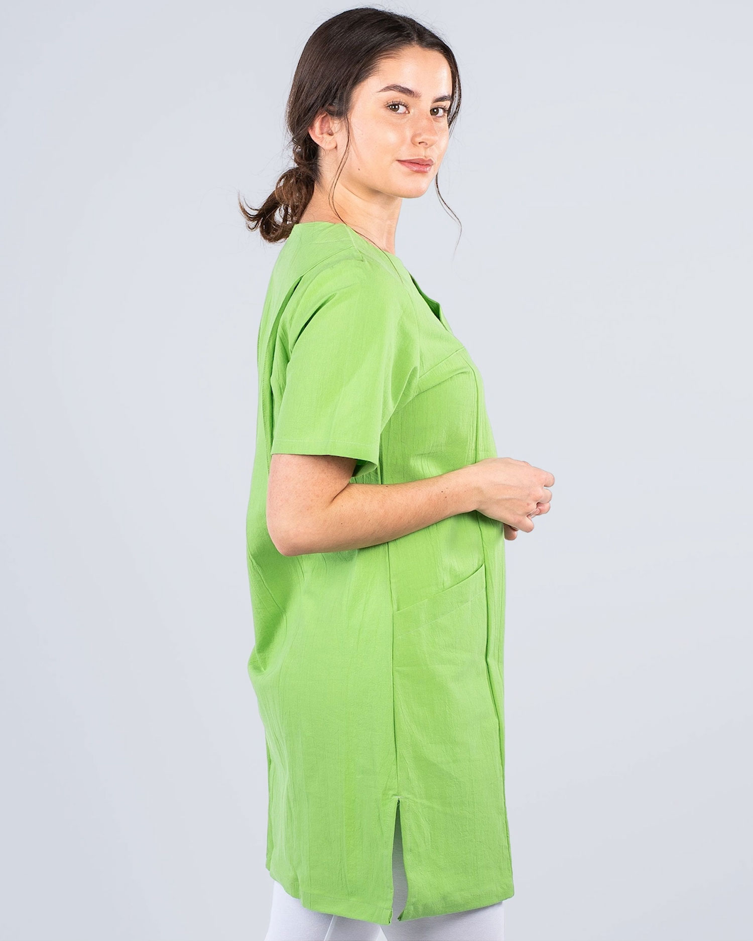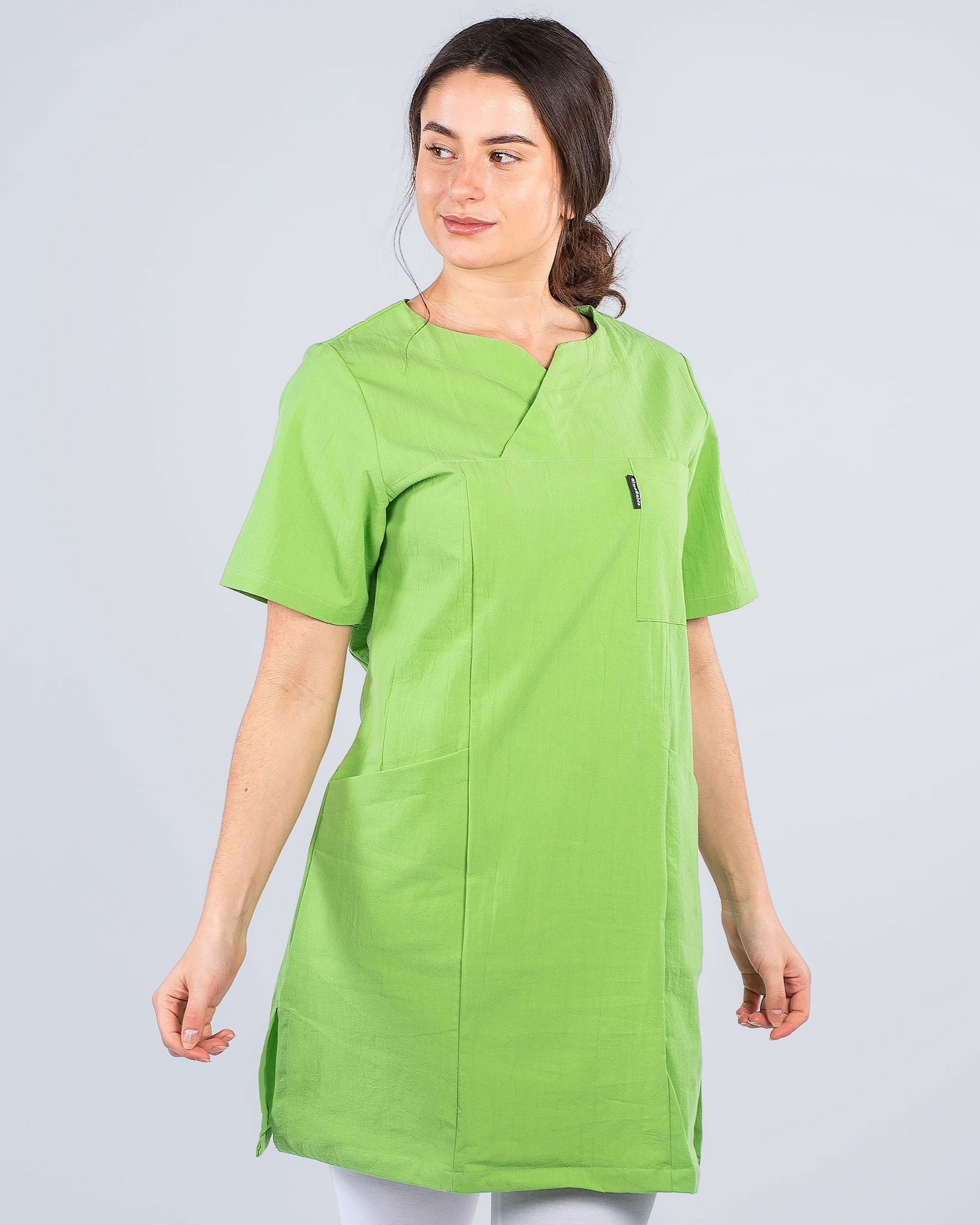 Behagelig arbeidskjole i knelang modell. Kjolen har ringet v-hals og er lett figursydd for en fin passform. Med både brystlomme og to hoftelommer får du godt med plass for arbeidsutstyr. Kjolen er tilvirket i kriklet bomull hvilket gir den en sval og behagelig følelse samtidig som stoffet minsker behovet av stryking.