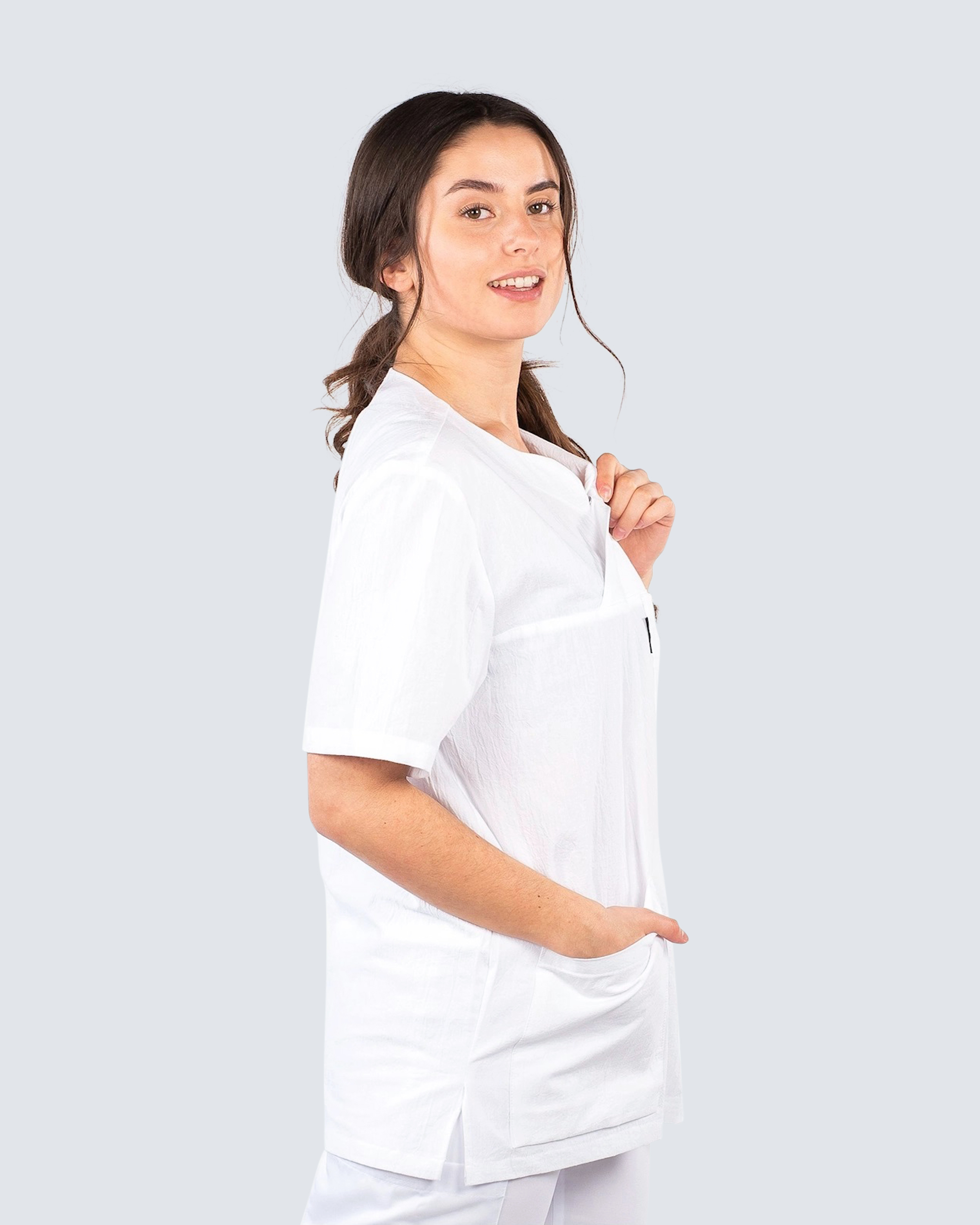 Kittel i en rett unisex modell med praktiske og romslige lommer som har godt om plass for arbeidsutstyr. Hoftelommene har mobillomme og nøkkelhank som du enkelt kan feste nøkler eller ID-kort. Kitlen har rund v-hals hvilket gir en fin detalj. Med splitt i sidene får du godt med bevegelsesfrihet. Kitlen er tilvirket i kriklet bomull hvilket gir en sval og behagelig følelse. Det kriklete stoffet minsker også behovet av skjøtsel, så som strykning.