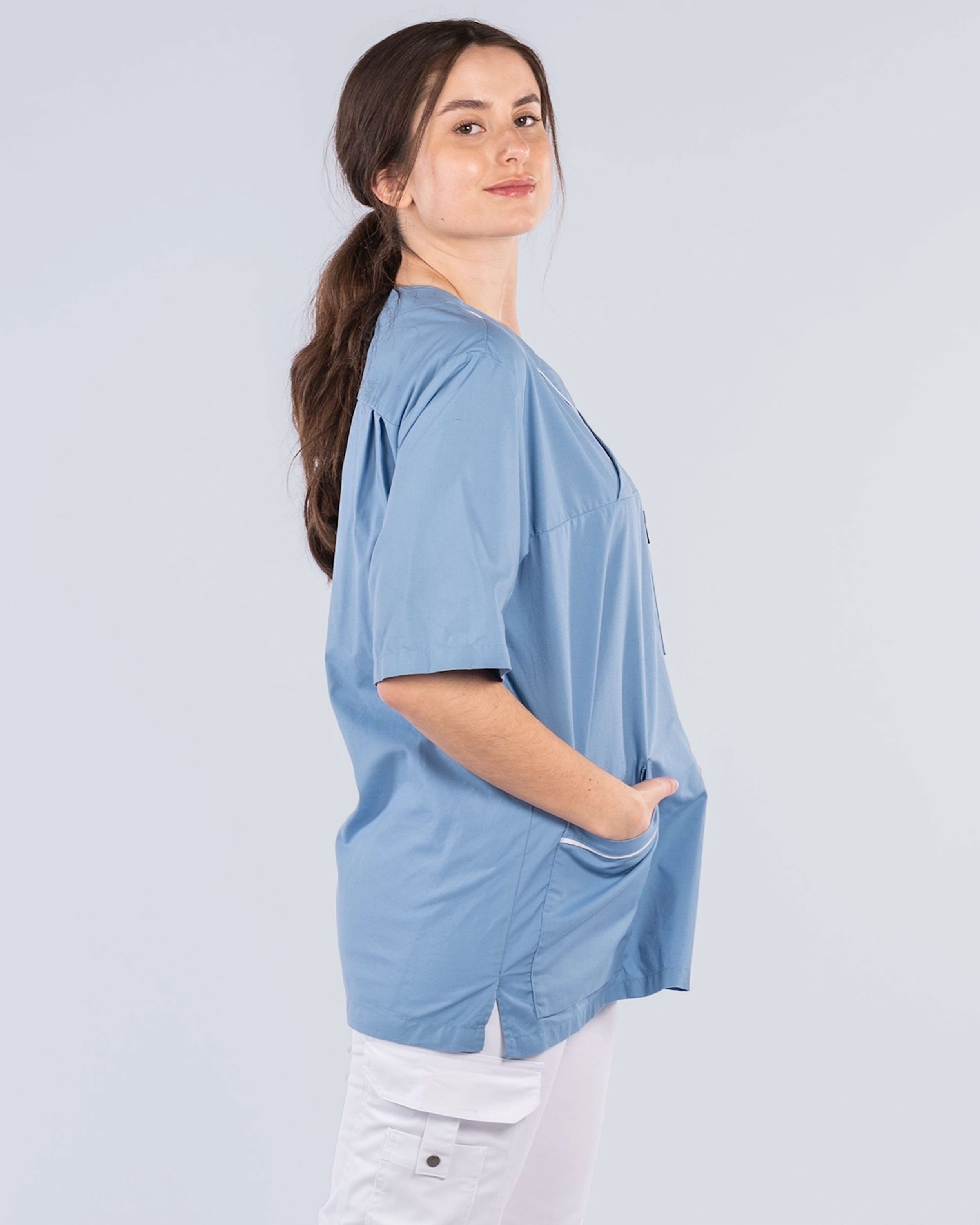Arbeidsbluse med behagelig passform og godt bevegelsesvidde takket være både spalte i siden og ryggfold bak. Blusen har fine detaljer med passepoil ved halsen og lommene. Blusen har v-hals og er sydd i en rett modell.