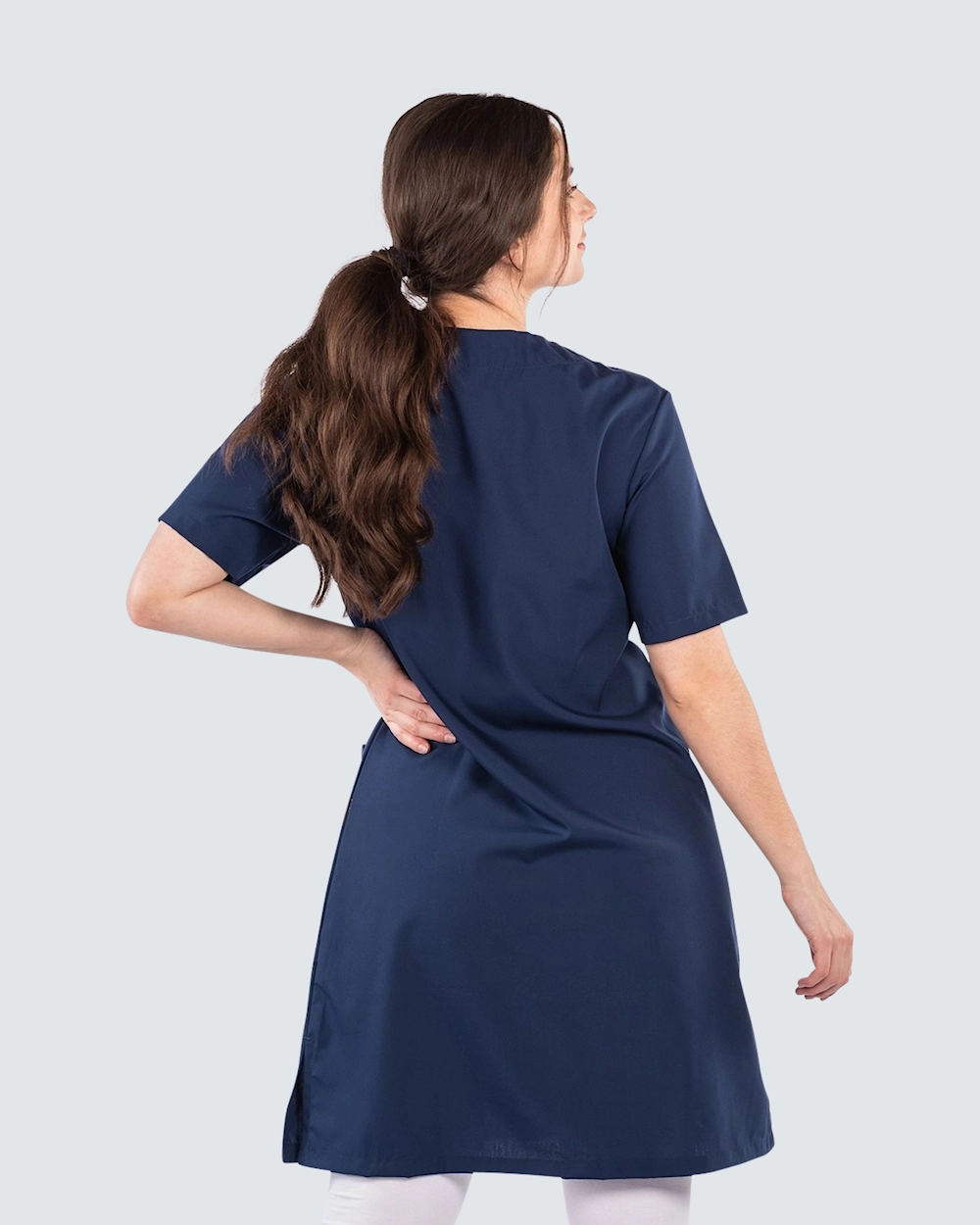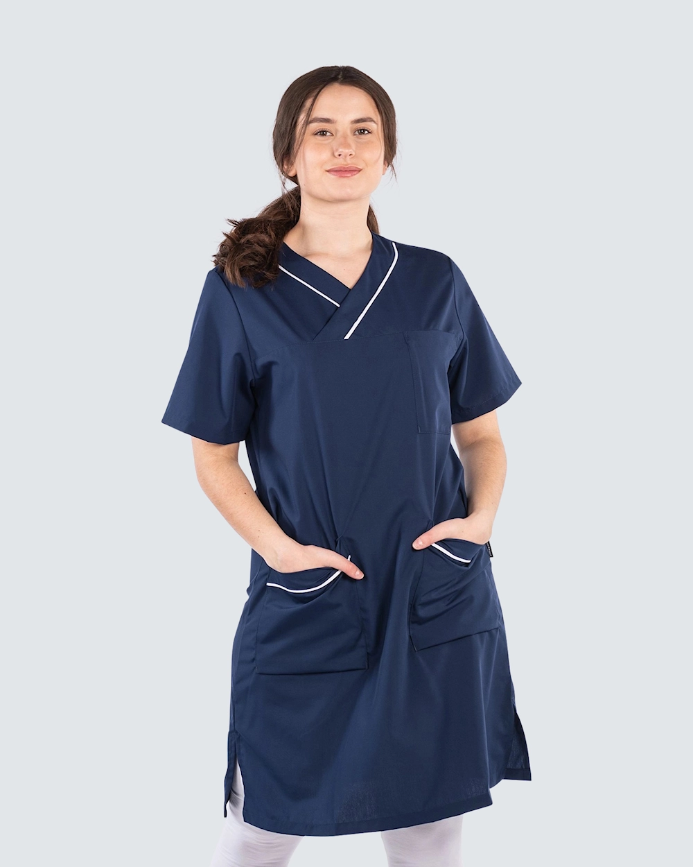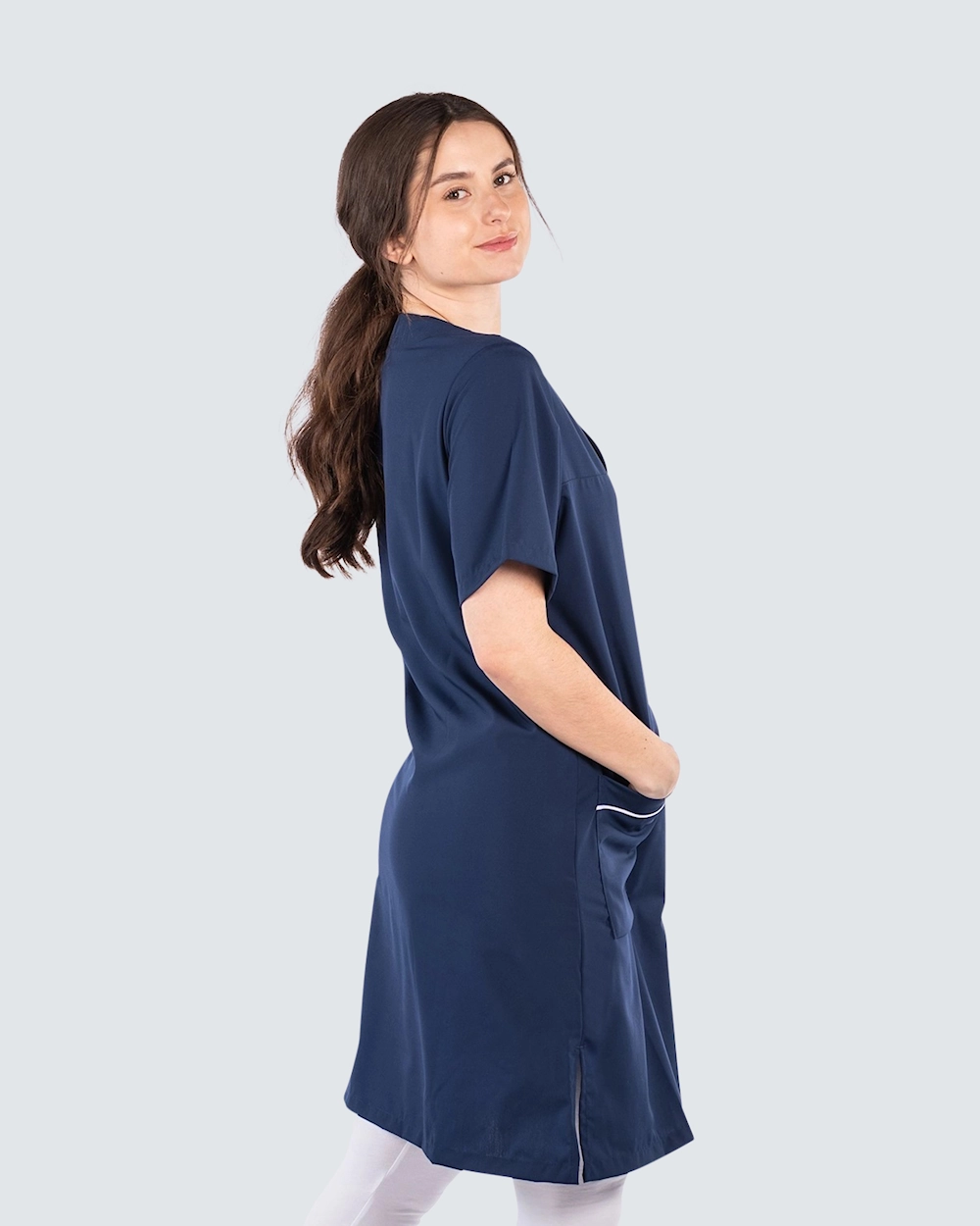 Denne arbeidskjolen fra Almedahls er en behagelig kjole med fine detaljer. Kjolen er lett skreddersydd for en fin passform og har dekorative detaljer med passepoil ven v-halsen og lommene. Med brystlomme og to romslige frontlommer får du god plass til penner, noteringsblokk og arbeidsutstyret du trenger å ta med deg. Kjolen er laget av det miljøvennlige materialet Tencel som gir en sval og behagelig følelse.