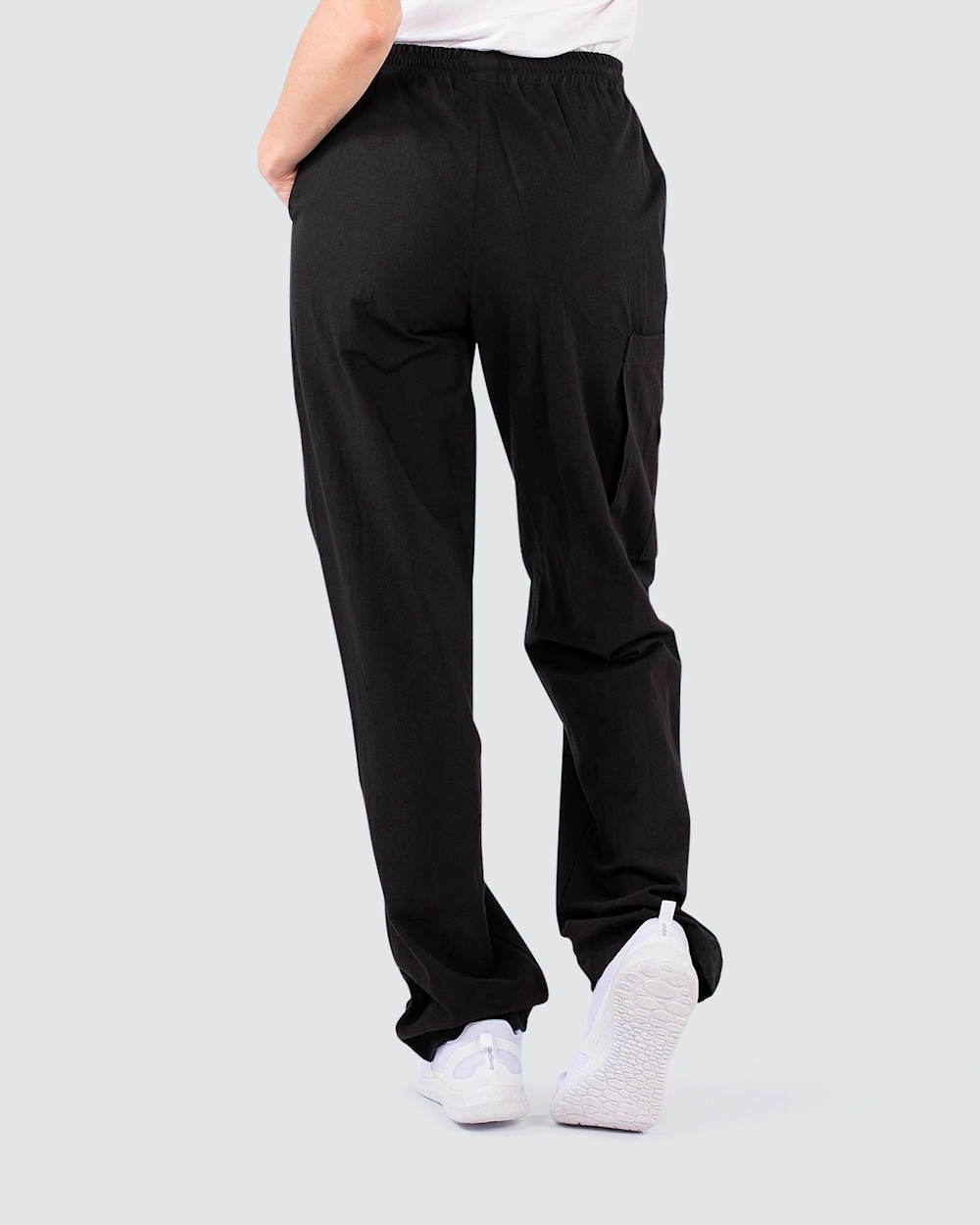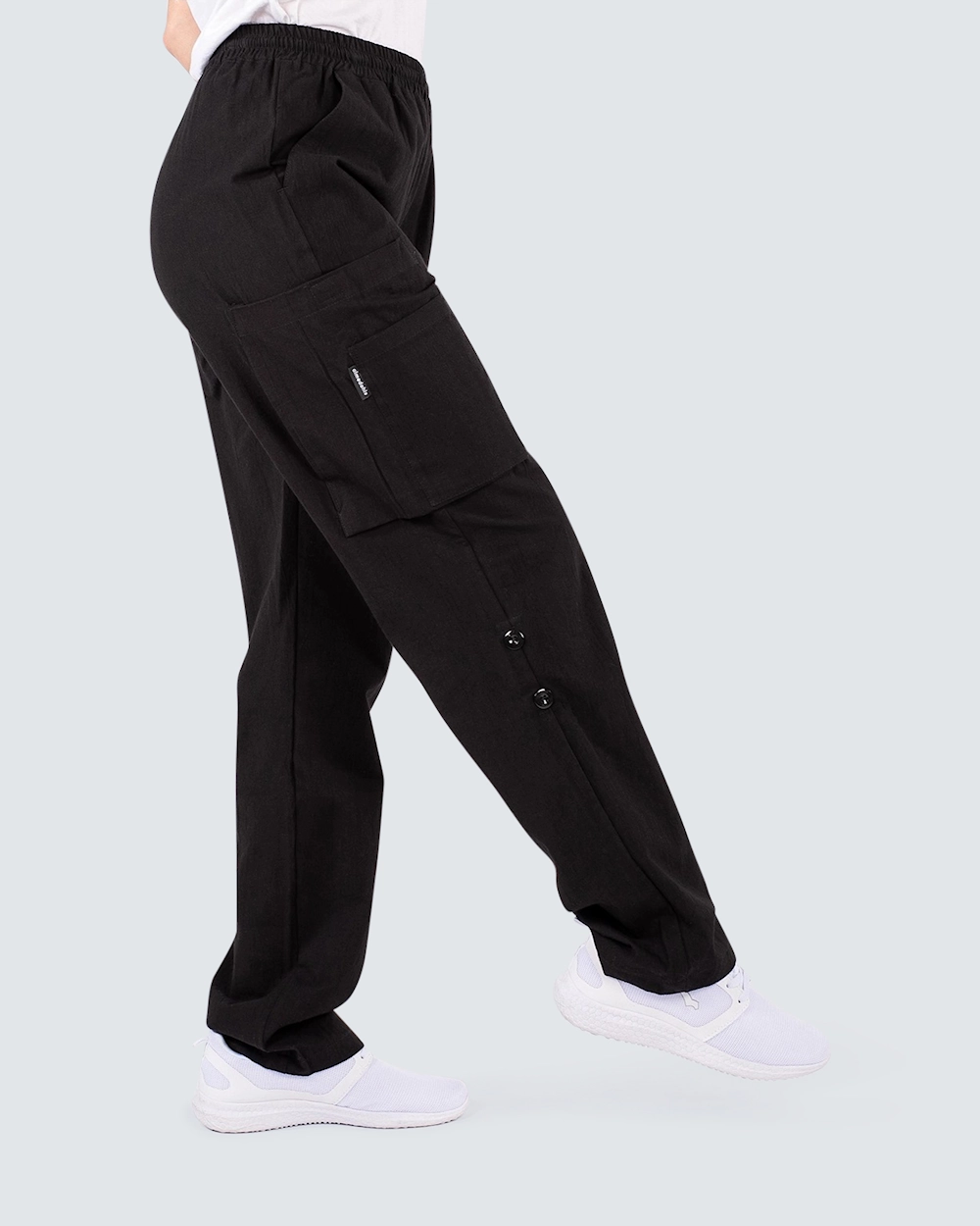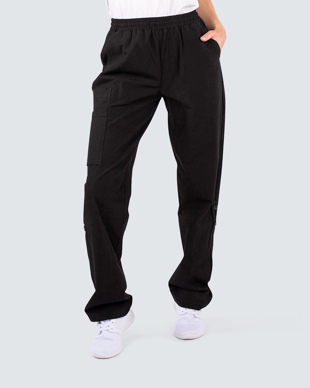 Behagelig arbeidsbukse med strikk i midjen. Buksen er tilvirket i kriklet bomull som gir en myk og behagelig følelse. Med knapp på benet bretter du enkelt opp buksebenet og kan bruke buksen som en ¾ bukse. Med den brettbare muligheten og den svale kriklete bomullen blir det den perfekte arbeidsbuksen også på sommeren.