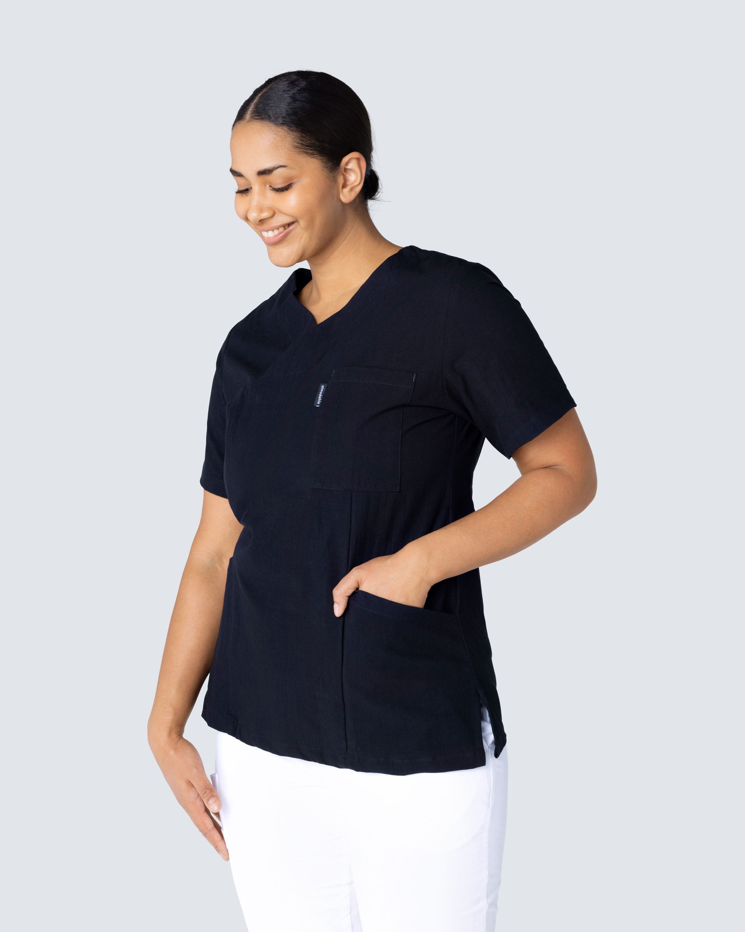 Kittel i kriklet bomull som gir en lett og sval følelse. Den kriklete bomullen krever minimalt med skjøtsel, så som styking. Kitlen har v-hals og er lett innsvingt i modellen, hvilket gir den en fin silhuett og passform. Med både brystlomme og to hoftelommer med mobillomme og nøkkelhank har du godt med plass for diverse arbeidsutstyr og artikler du trenger under en arbeidsdag.