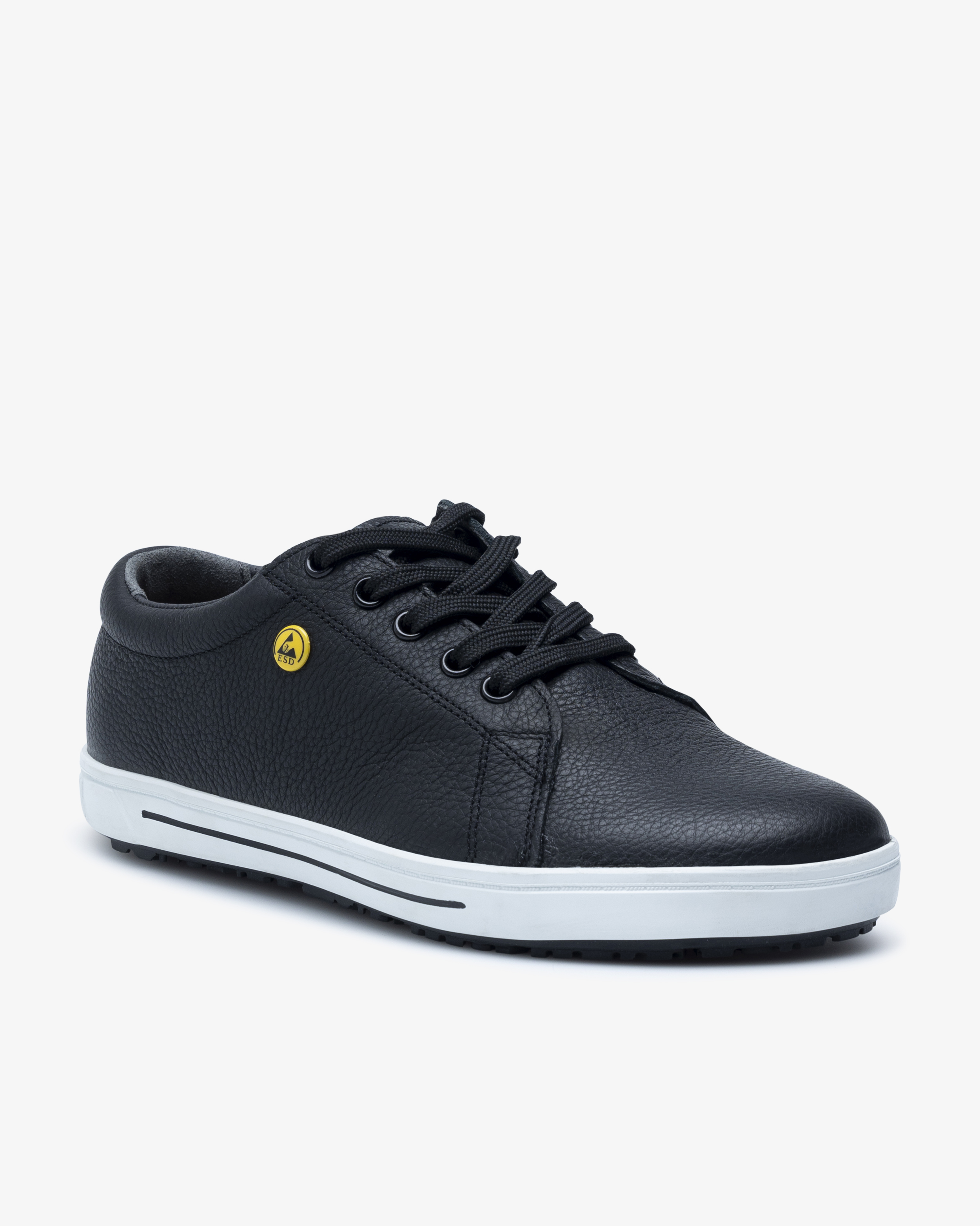 QO500 fra BIRKENSTOCK er en moderne og stilig snøresko som er utviklet for deg som jobber lange dager på beina - også i teknisk krevende miljøer. Den anatomisk formede fotsengen av kork og mikrofiber er utskiftbar og gir stabil støtte og effektiv avlastning gjennom hele arbeidsdagen. Denne ESD-varianten er spesielt utviklet for deg som arbeider med mikroelektronikk eller høyfrekvent teknologi. Skoen garanterer en aktiv og permanent elektrostatisk utladning (ESD), noe som reduserer risikoen for skader på følsomt utstyr. Det gule, runde emblemet viser at skoen oppfyller ESD-kravene (opptil 35 Mohm). Yttermaterialet består av vannavvisende glatt skinn (WRU) med antistatisk beskyttelse. Yttersålen i nitrilgummi er sklisikker, olje- og bensinbestandig, og hælen er utformet for å absorbere energi. Skoen er sertifisert i henhold til EN ISO 20347:2012 og oppfyller kravene til beskyttelsesklasse O2.