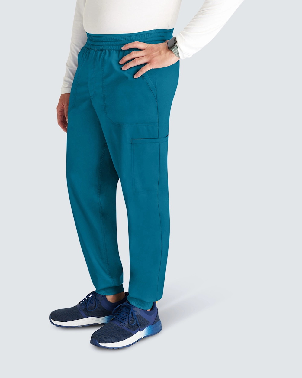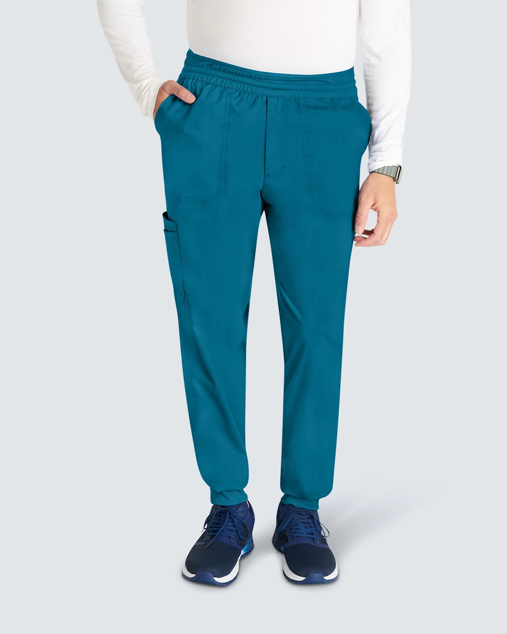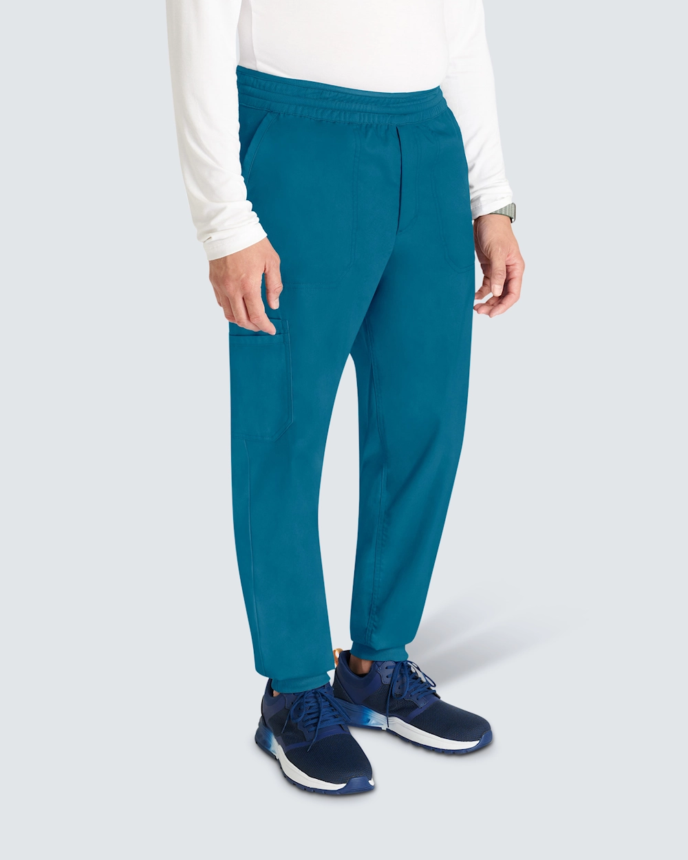 Joggebuksen med mansjett for menn kombinerer komfort og funksjon, perfekt for lange arbeidsdager. Buksene har en moderne passform og midjehøy midje, og de har en sporty stil med strikk bak og snøring for en fleksibel passform. Pull-on-designet har smarte lommeløsninger: skrålommer foran, en baklomme, cargo-lommer og en dobbel sidelomme. Dobbeltsøm foran, bak og langs sømmene gir slitestyrke og en stilig finish, mens den falske gylfen opprettholder et klassisk utseende uten at det går på bekostning av komforten.