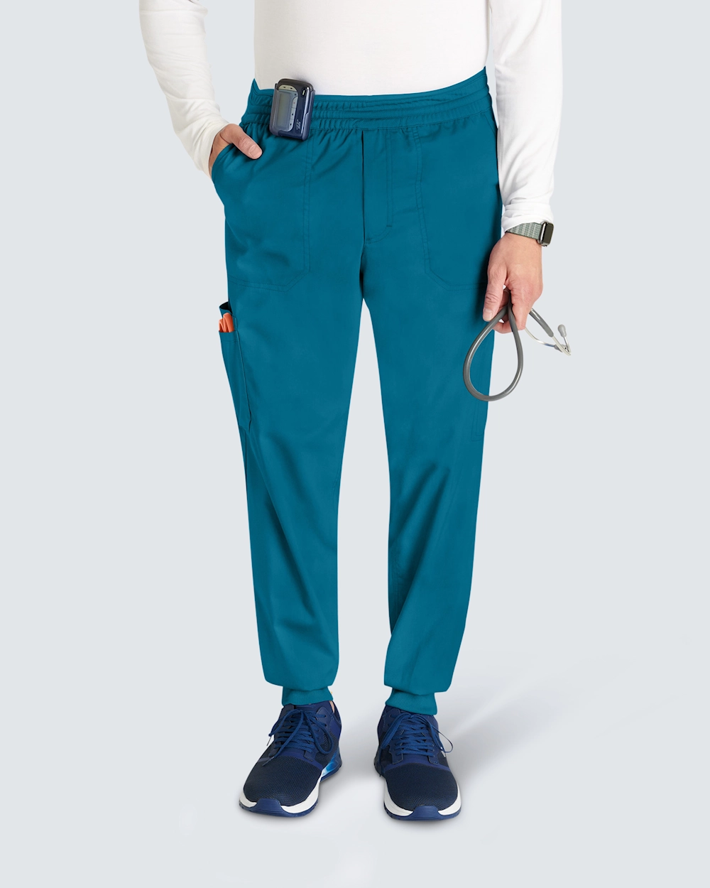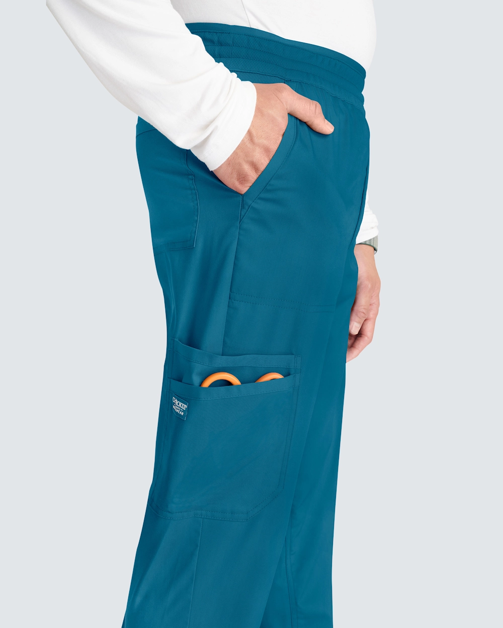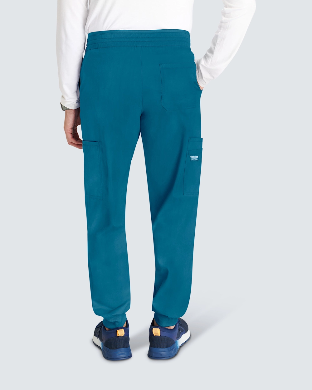 Joggebuksen med mansjett for menn kombinerer komfort og funksjon, perfekt for lange arbeidsdager. Buksene har en moderne passform og midjehøy midje, og de har en sporty stil med strikk bak og snøring for en fleksibel passform. Pull-on-designet har smarte lommeløsninger: skrålommer foran, en baklomme, cargo-lommer og en dobbel sidelomme. Dobbeltsøm foran, bak og langs sømmene gir slitestyrke og en stilig finish, mens den falske gylfen opprettholder et klassisk utseende uten at det går på bekostning av komforten.