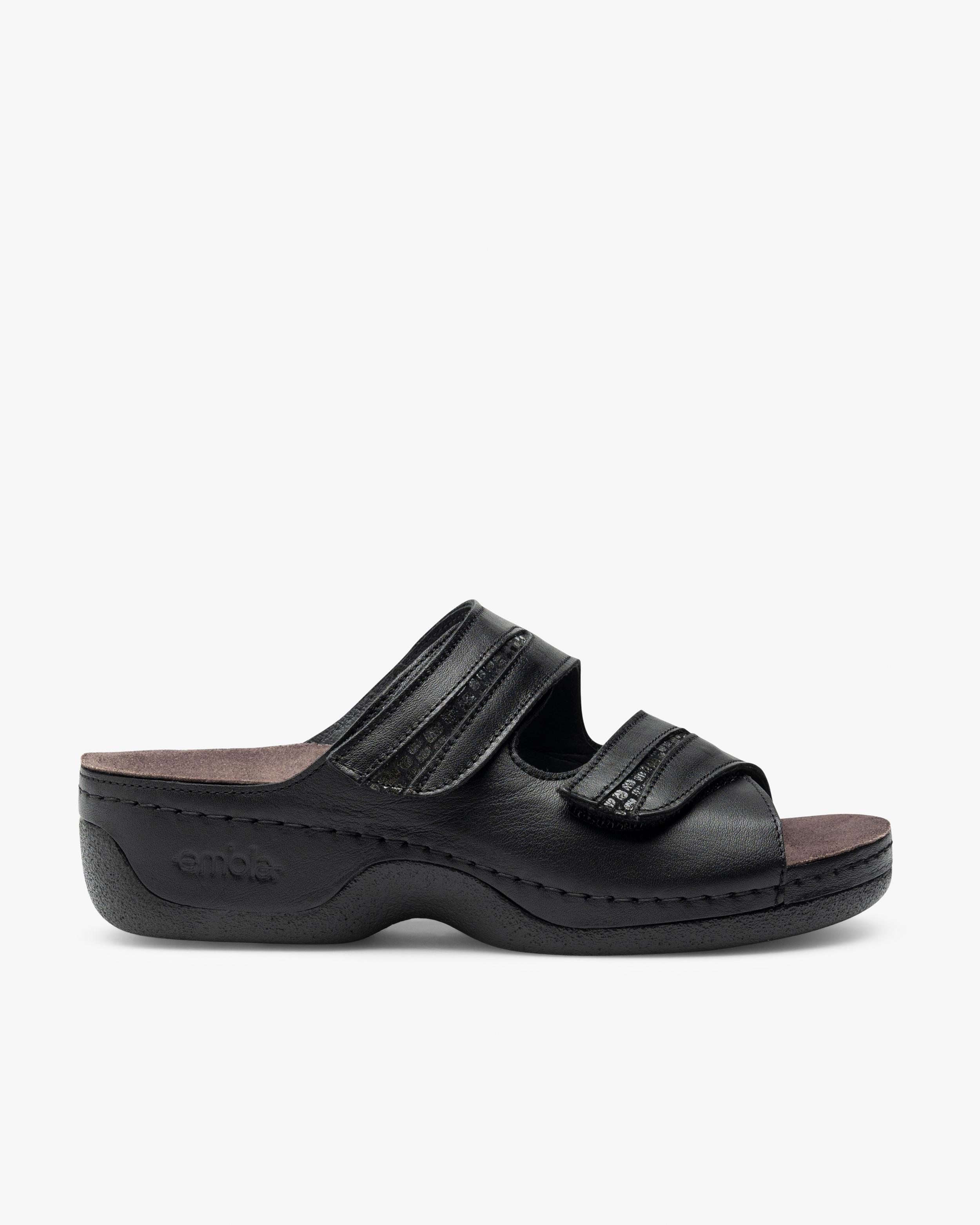 Damesandal i mykt skinn med utskiftbar, ergonomisk fotseng som gir støtte til fotbuen og løfter forfotbuen. Denne sandalen har justerbare remmer med borrelås og er skinnfôret. Yttersåle i gummiblanding som gir godt grep på underlaget, noe som gjør sandalen egnet for både innendørs og utendørs bruk.