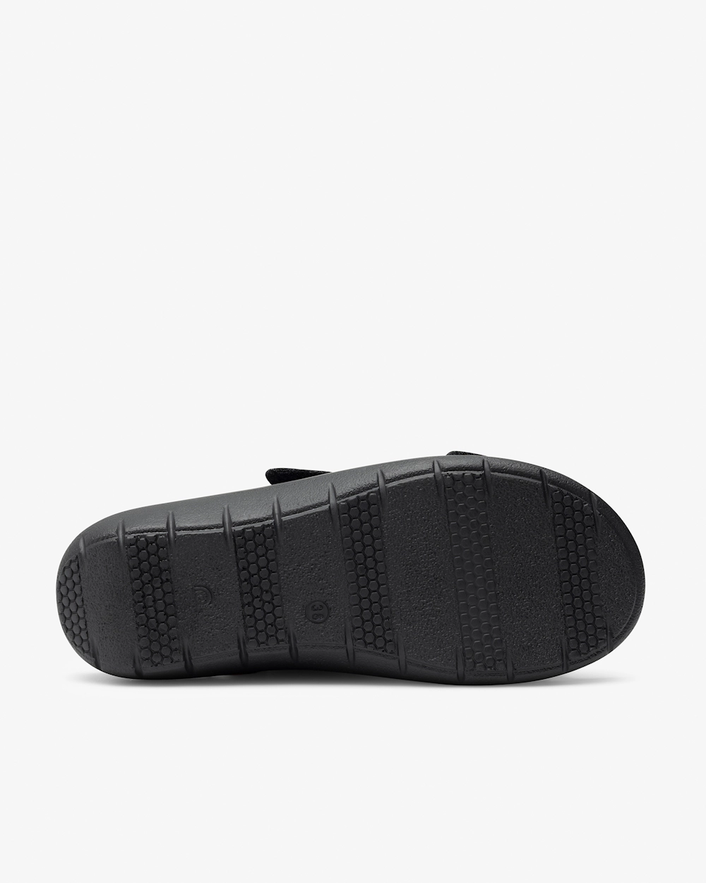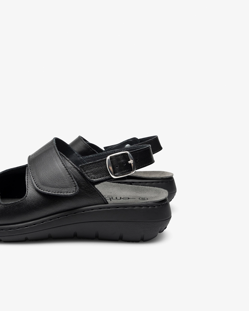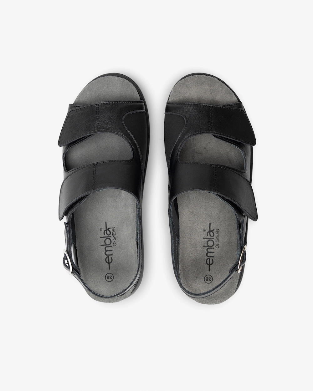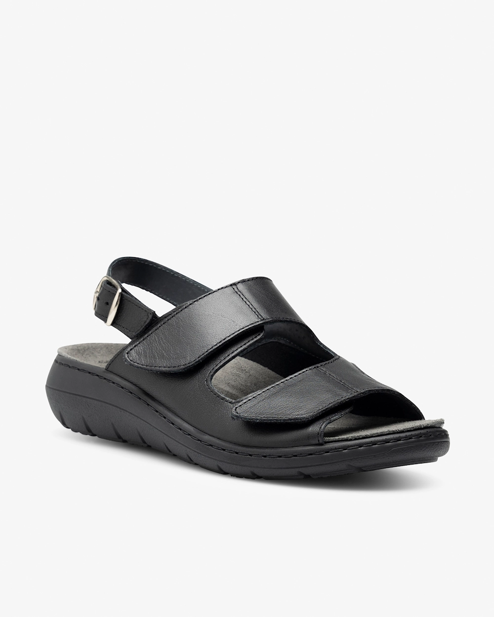 Fottilpasset sandal i damemodell med utskiftbar, ergonomisk fotseng som gir støtte til fotbue og løfter forfotbuen. Sandalens innside har et elastisk parti som gir ekstra fleksibilitet og komfort ved for eksempel Hallux Valgus. Stabiliserende, justerbar hælrem med spenne og to justerbare remmer med borrelås øverst.