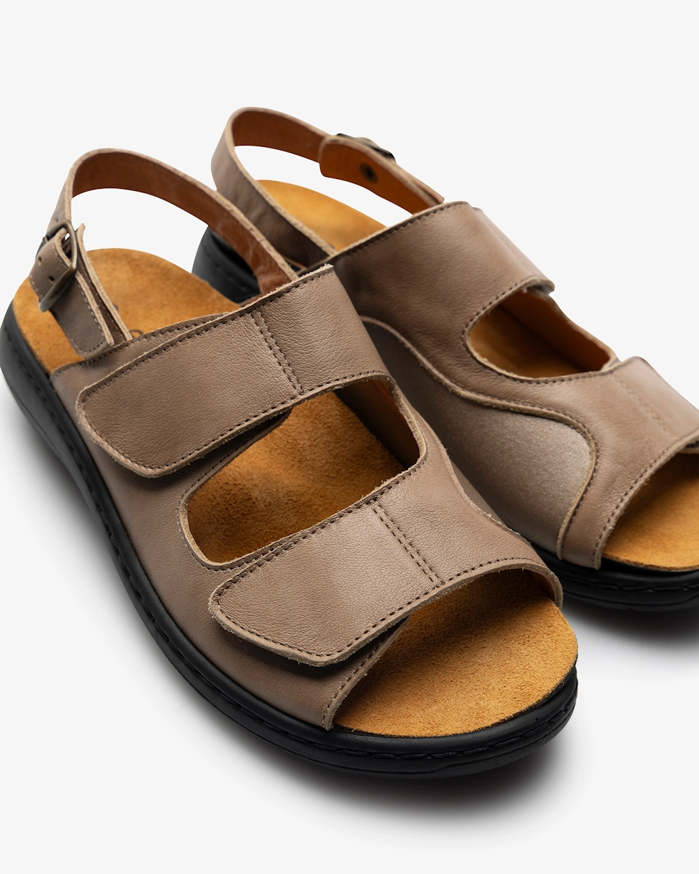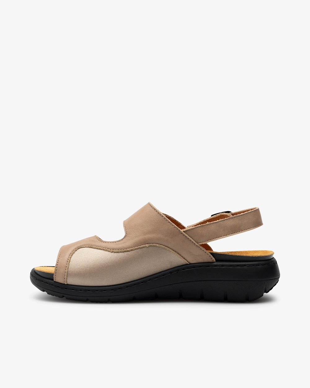 Fottilpasset sandal i damemodell med utskiftbar, ergonomisk fotseng som gir støtte til fotbue og løfter forfotbuen. Sandalens innside har et elastisk parti som gir ekstra fleksibilitet og komfort ved for eksempel Hallux Valgus. Stabiliserende, justerbar hælrem med spenne og to justerbare remmer med borrelås øverst.