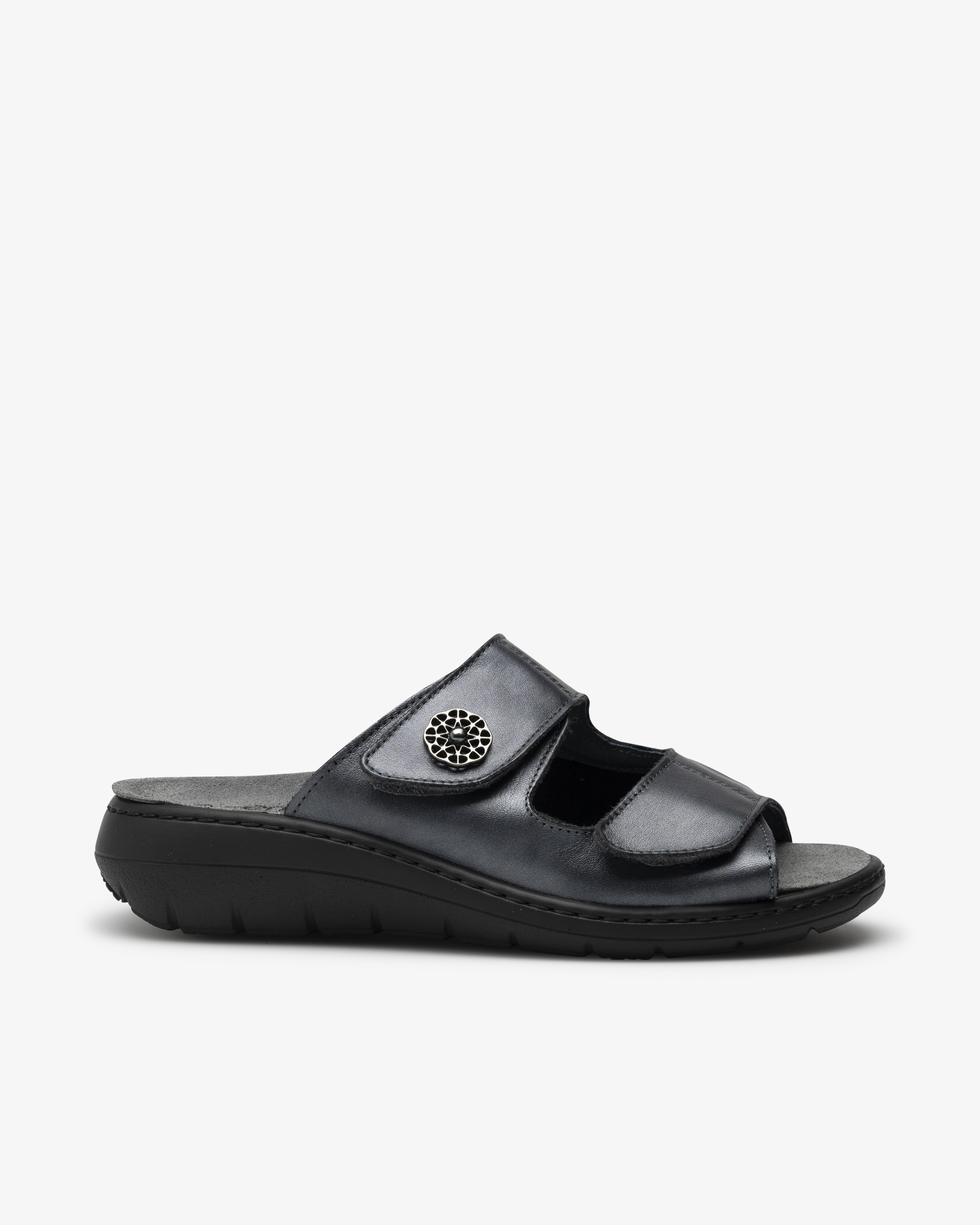 Fotformede sandaler i mykt skinn som kombinerer komfort og stil, perfekt tilpasset helsepersonell. De er utstyrt med justerbare stropper med borrelås og et elastisk parti. De tilbyr dermed ekstra komfort for de med hallux valgus. Den ergonomiske fotbuen kan byttes ut, noe som gir fleksibilitet og maksimal støtte til føttene under lange arbeidsøkter. Nyt et produkt som sikrer at føttene dine får den pleie og komforten de fortjener, uten at det går på kompromiss med moderne design. Ideelt for deg som ønsker å uttrykke din personlige stil på jobben.