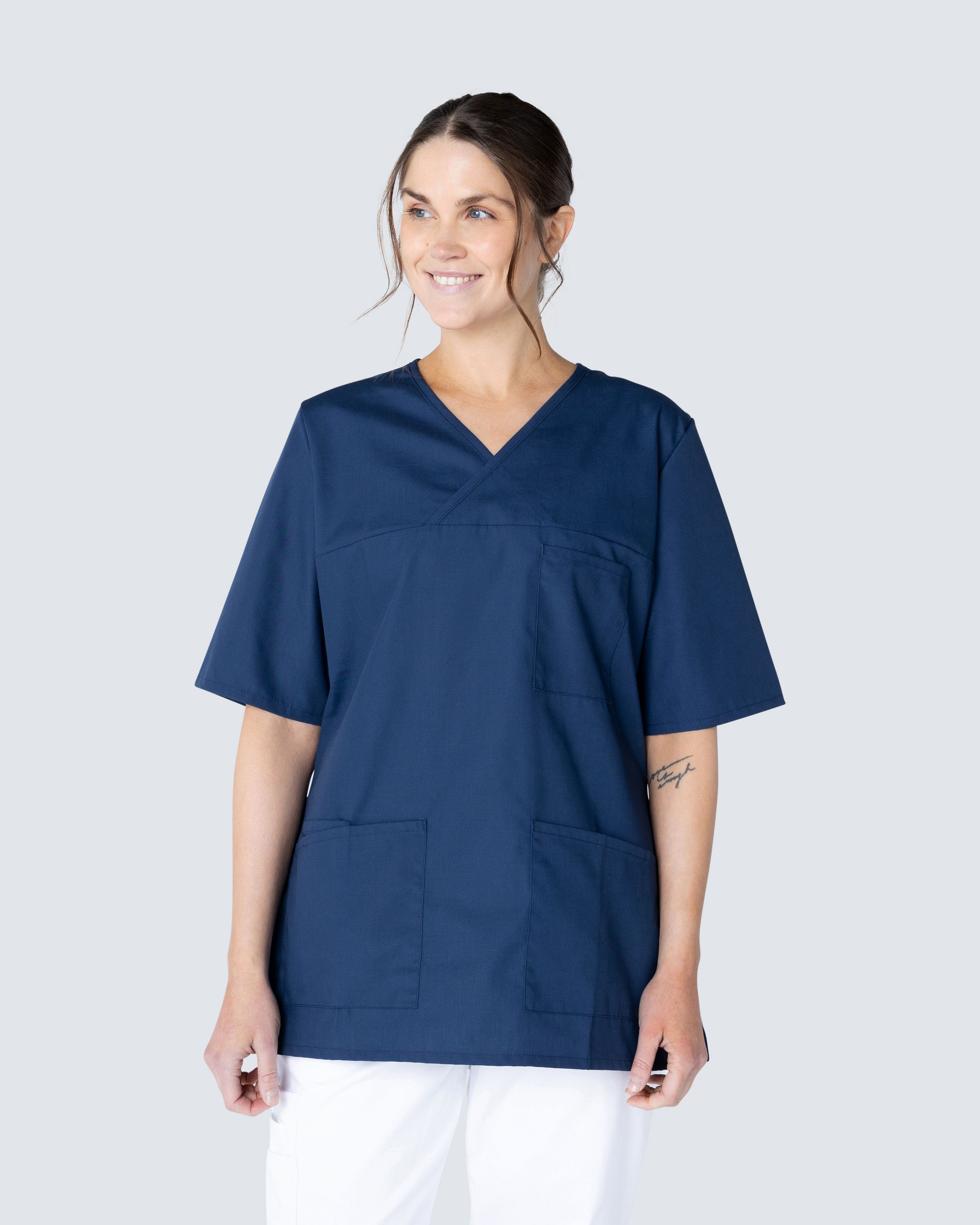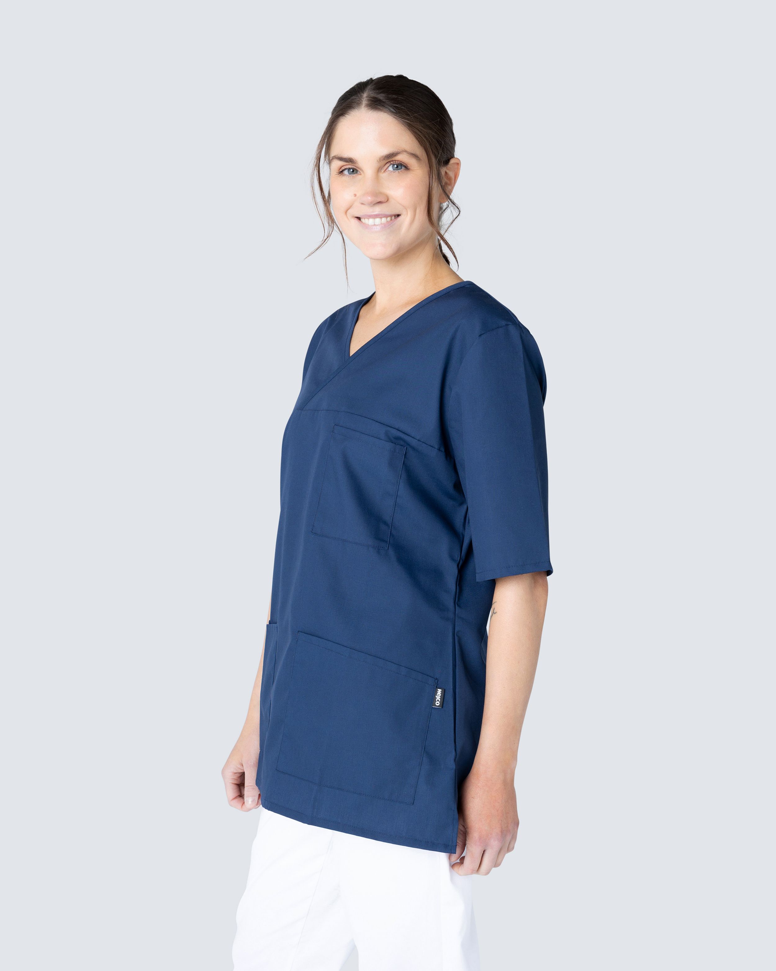Juni er en stilig arbeidstunika i damemodell fra Hejco. Tunikaen har v-hals og er lett figursydd for en fin passform. Med brystlomme og to romslige hoftelommer får du god plass for arbeidsutstyr. Den ene hoftelommen har en nøkkelhank for praktisk forvaring av nøkler eller ID-kort. Tunikaen har splitt på sidene for en behagelig bevegelsesfrihet.