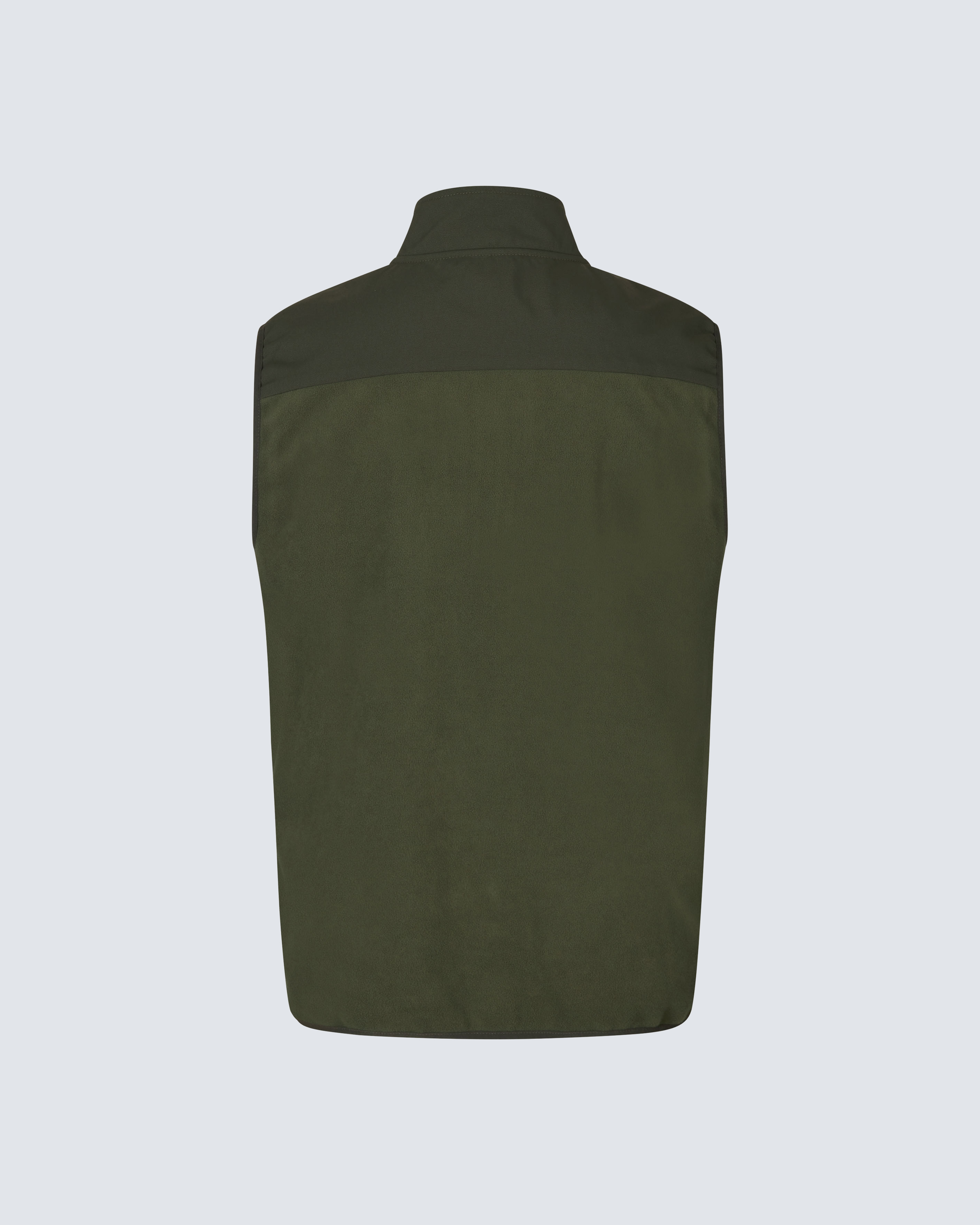 Den er laget av mykt, bindende fleecemateriale som også dekker innsiden av kragen, noe som gjør det til en vest som både gir komfort og varme.