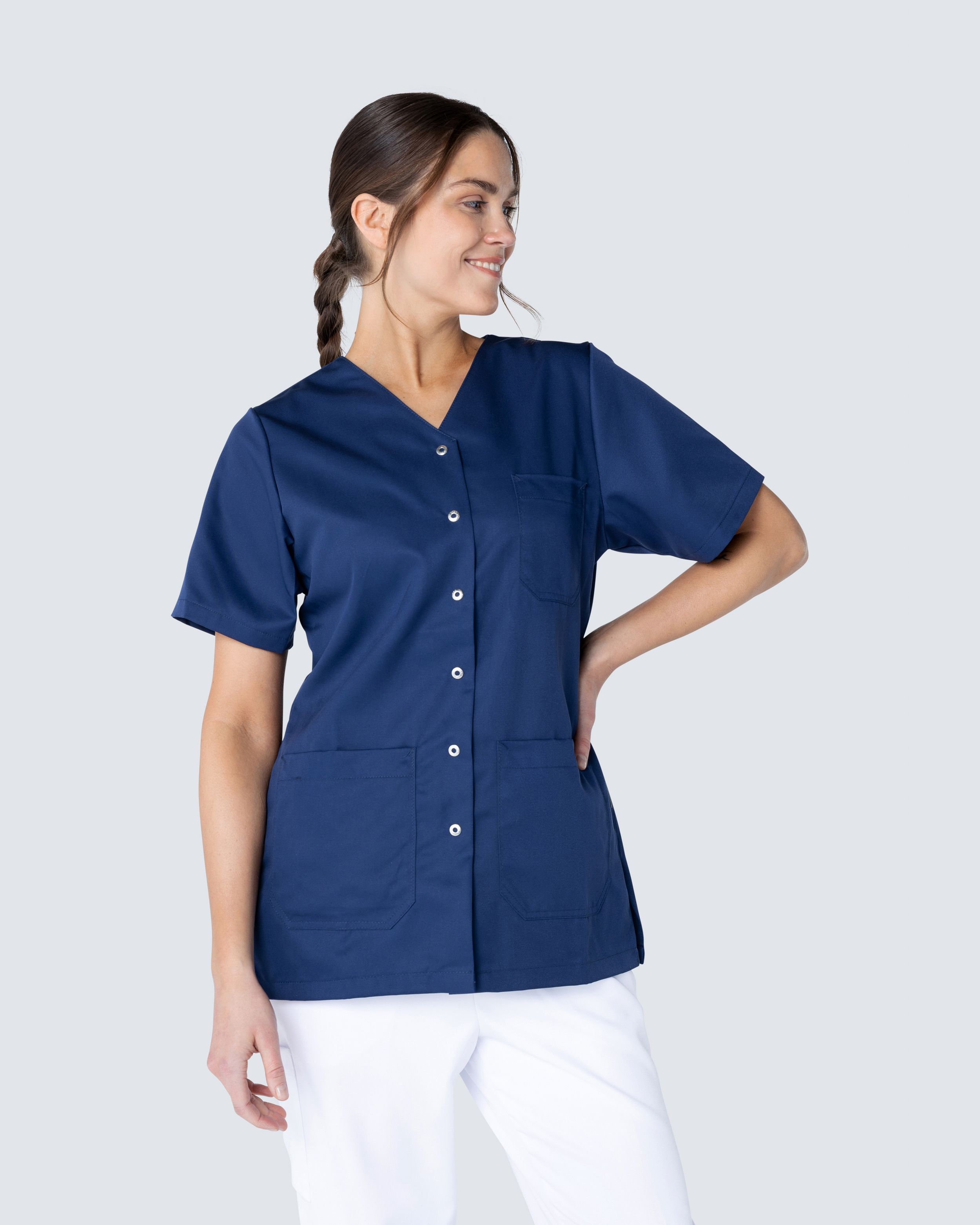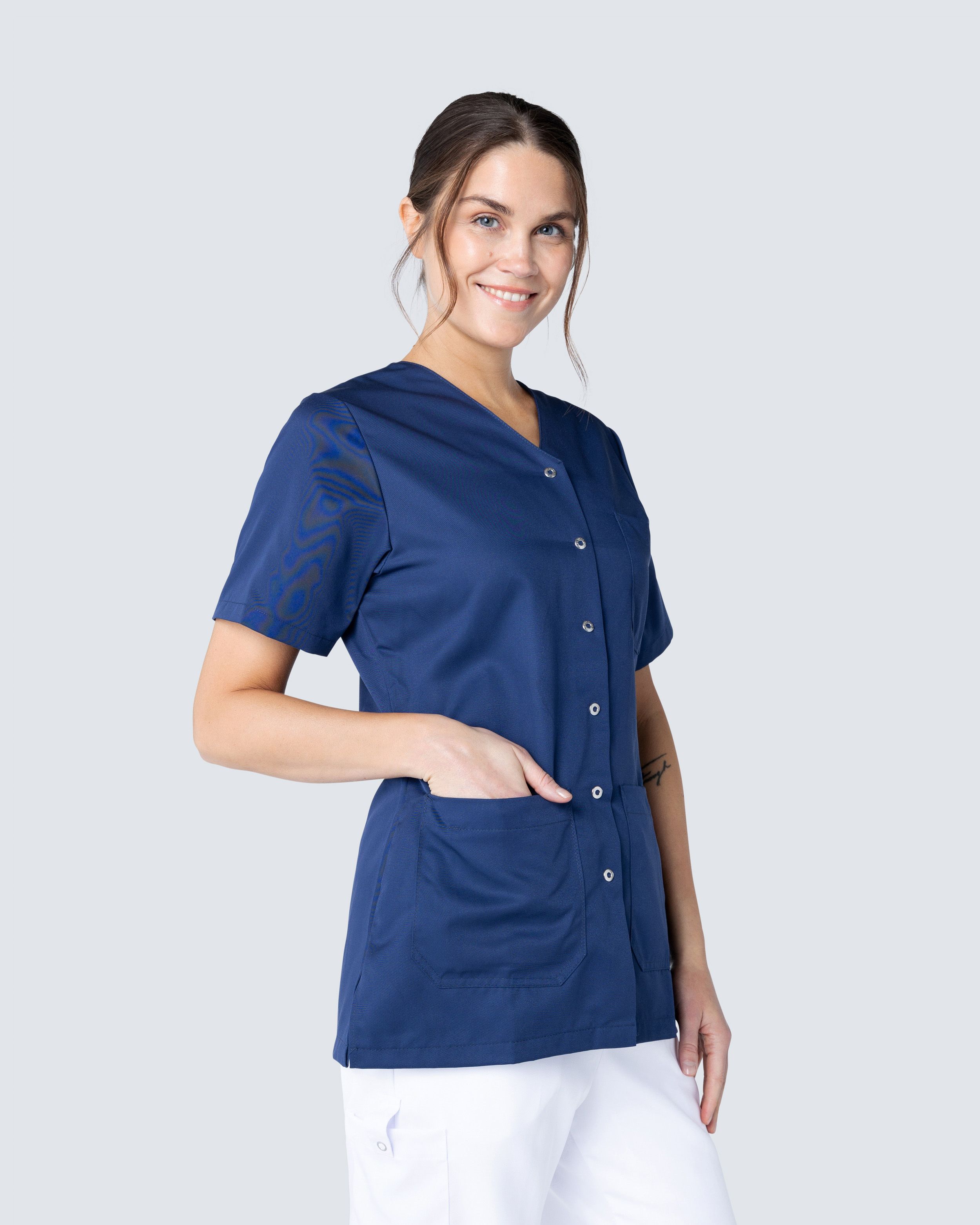 Helsetunika i damemodell med lett skreddersydd form for en fin passform. Praktisk knappslag med trykknapper - perfekt for deg med et pleieyrke der det er mye smuss og søl og du ikke vil trekke tunikaen over hodet. Tunikaen er laget av miljøvennlig Tencel som gir god komfort og god pusteevne.