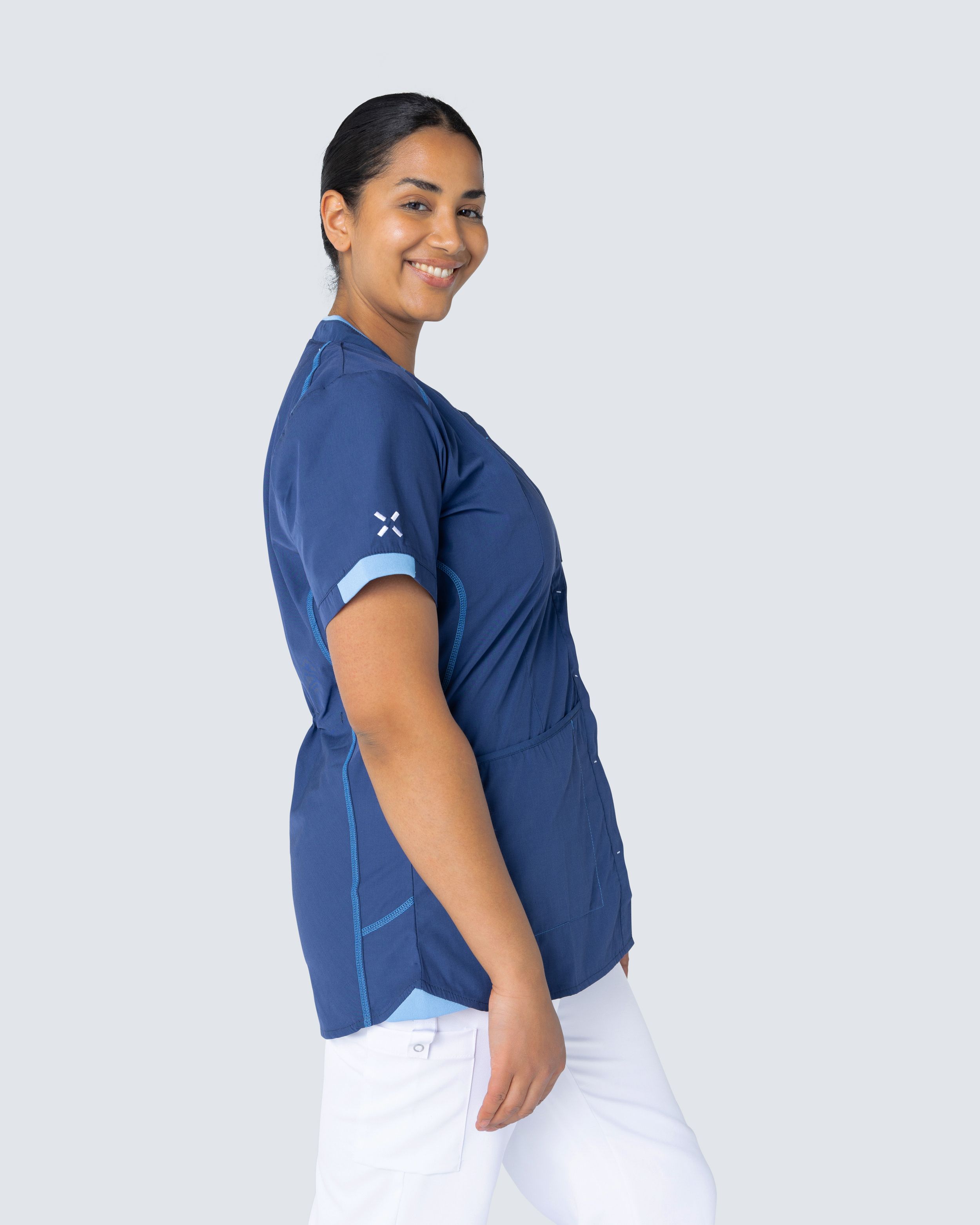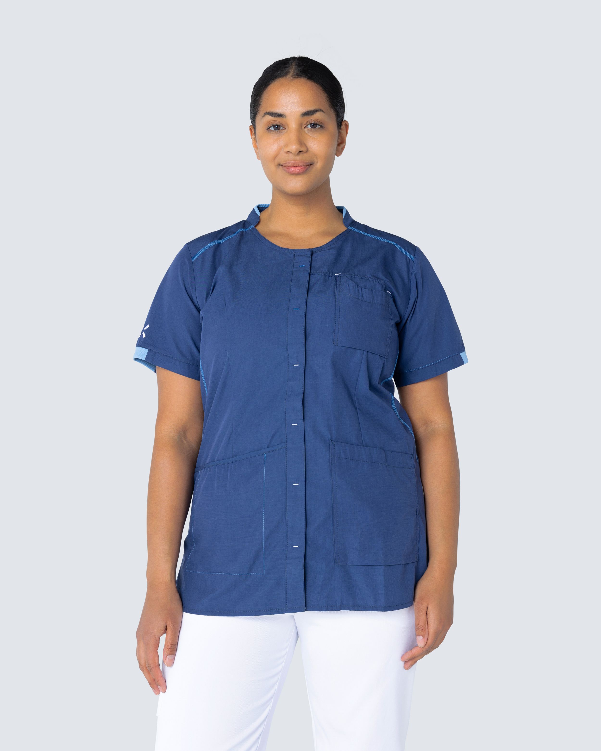 Skjorte med lett innsvinget midje, og justerbar og elastisk rygg, for bedre bevegelsesfrihet. Feminin ståkrage og skjulte trykknapper.