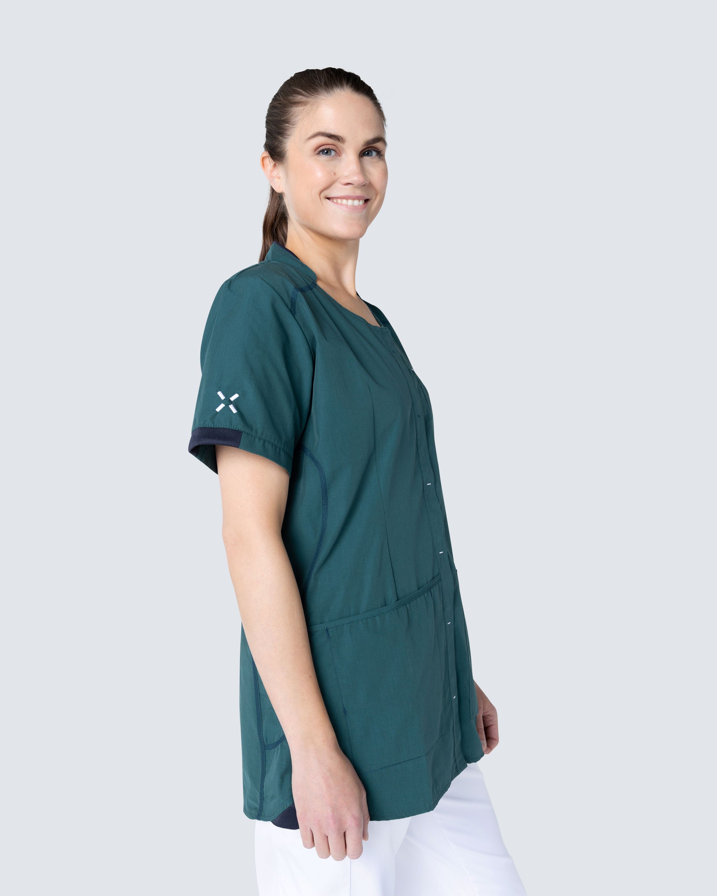 Skjorte med lett innsvinget midje, og justerbar og elastisk rygg, for bedre bevegelsesfrihet. Feminin ståkrage og skjulte trykknapper.