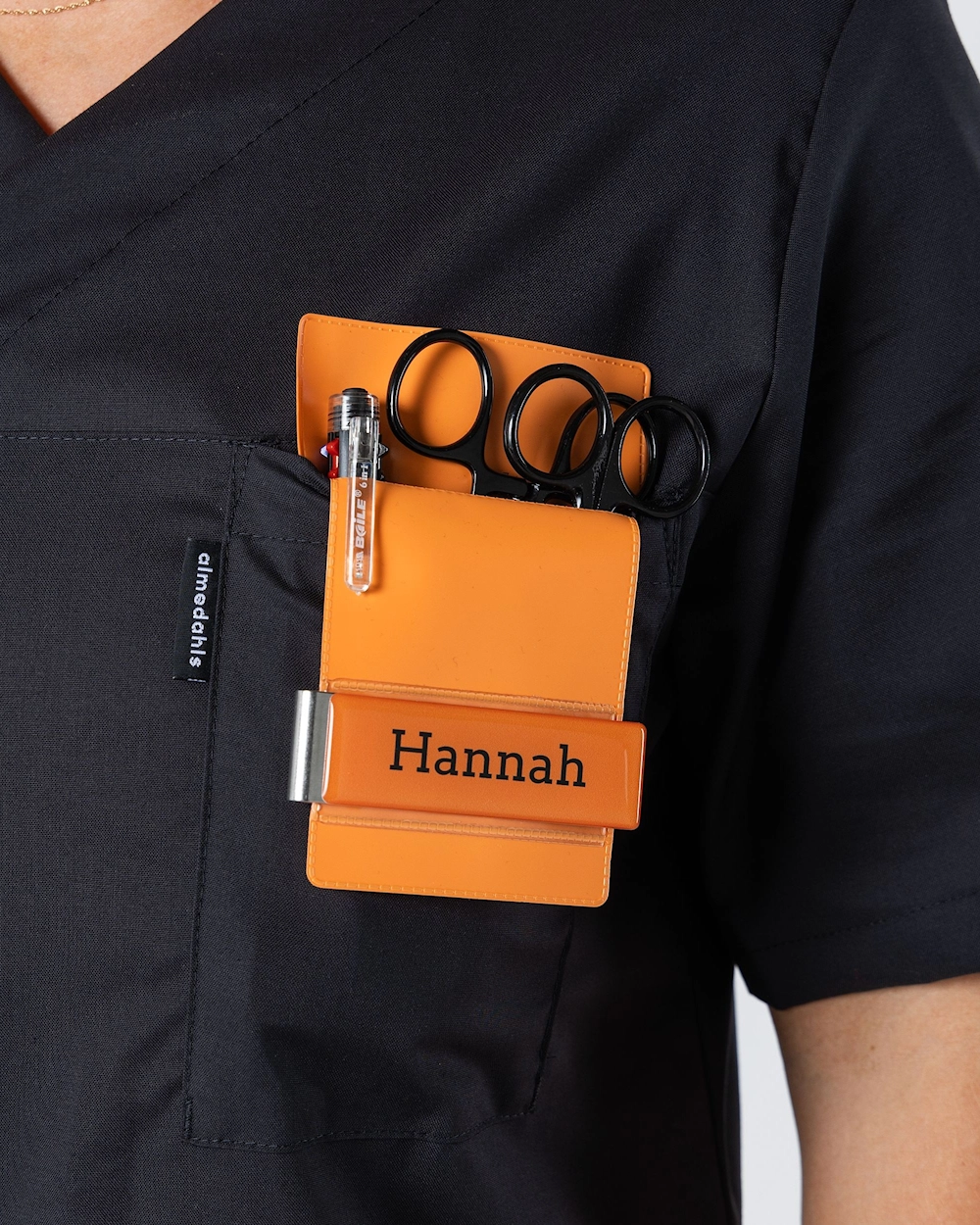 En fargerik pennlomme i matt plast, som sikrer at dine penner ikke forsvinner samtidig som den beskytte klærne dine mot blekklekkasje. En ryddig måte å alltid ha en penn tilgjengelig.