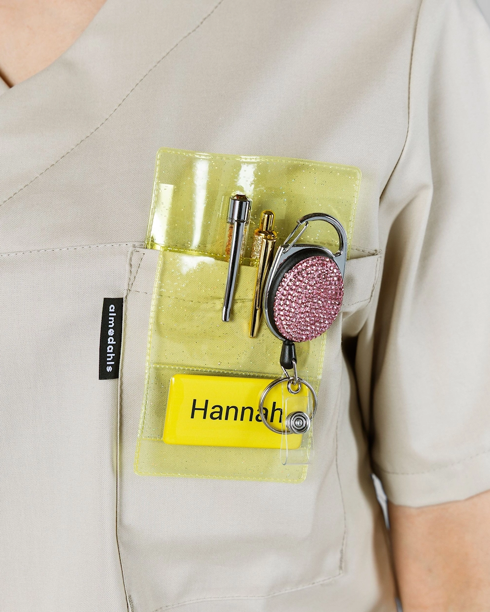 Glitter pennelomme som sørger for at pennene dine ikke forsvinner samtidig som den beskytter plaggene dine mot blekklekkasje. En stilig måte å alltid ha en penn like ved hånden. På forsiden av pennelommen er det også en lomme perfekt for navneskiltet.