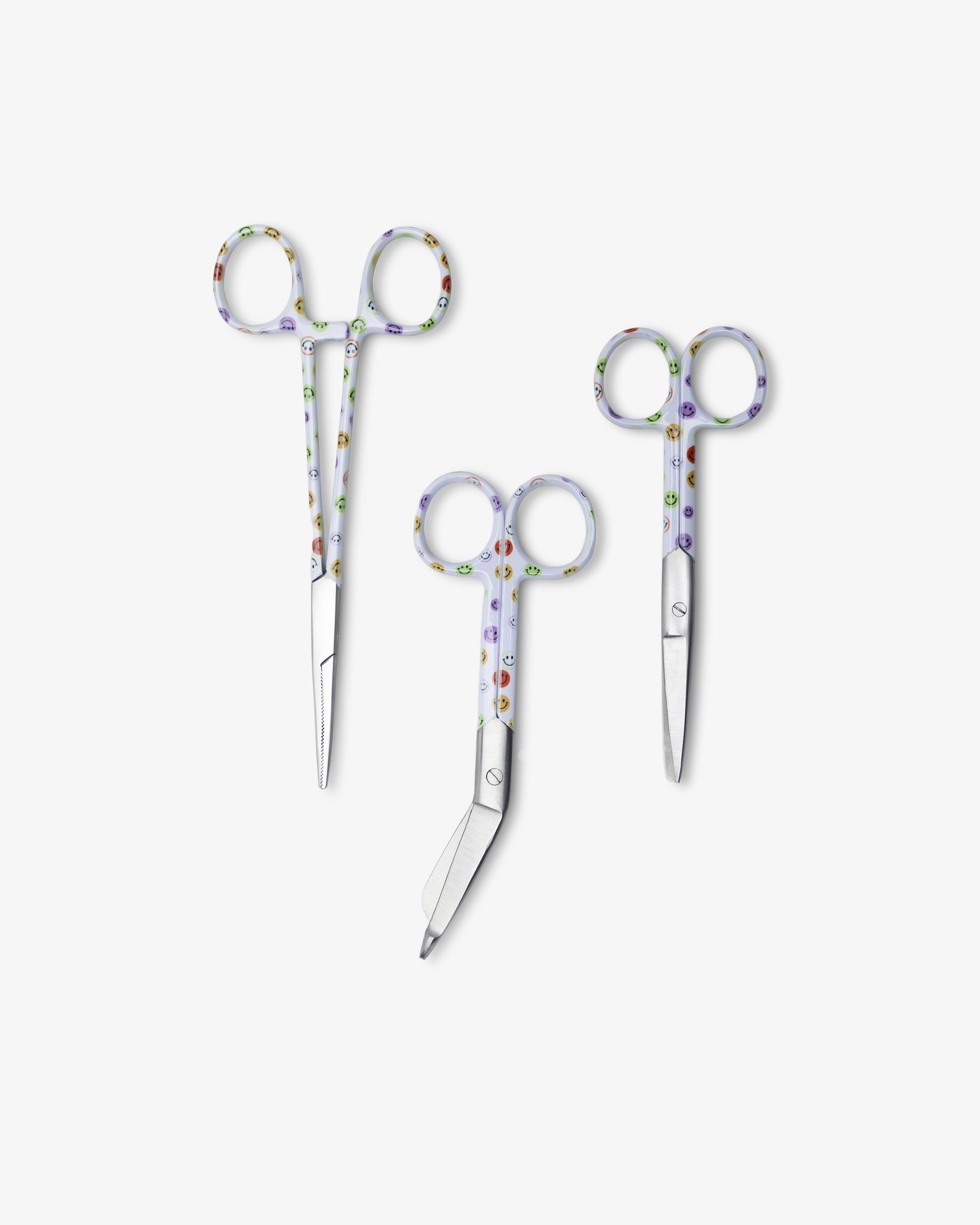 Spre positiv energi på avdelingen med vårt 3-pack sakser i mønsteret "Happy". Dette fargerike settet inneholder de viktigste redskapene for en sykepleier eller helsefagarbeider. Du får en robust kraftsaks, en peang og en detaljsaks, alle laget i slitesterkt rustfritt stål. Perfekt for å sette farge på uniformen samtidig som du har funksjonelle verktøy lett tilgjengelig.