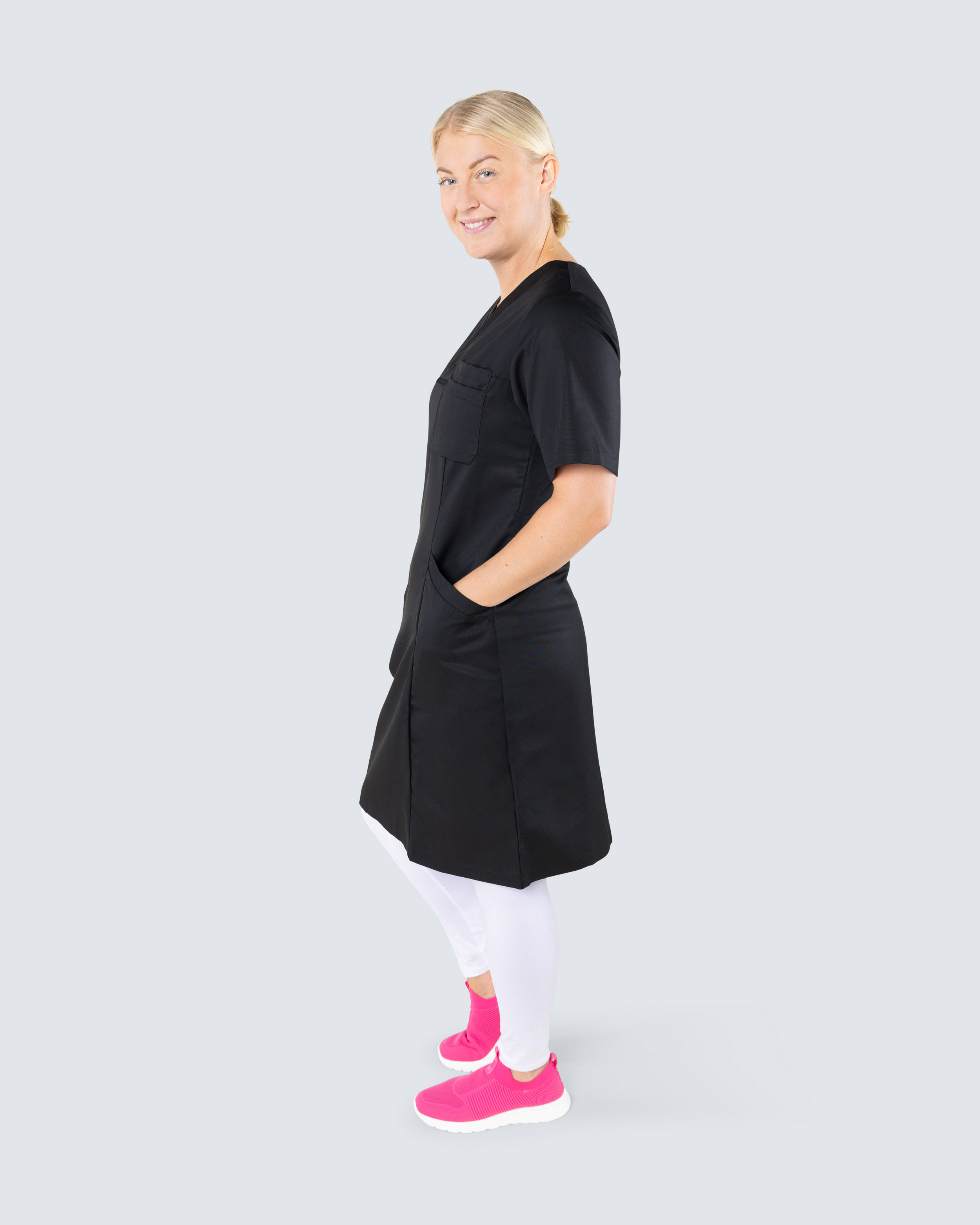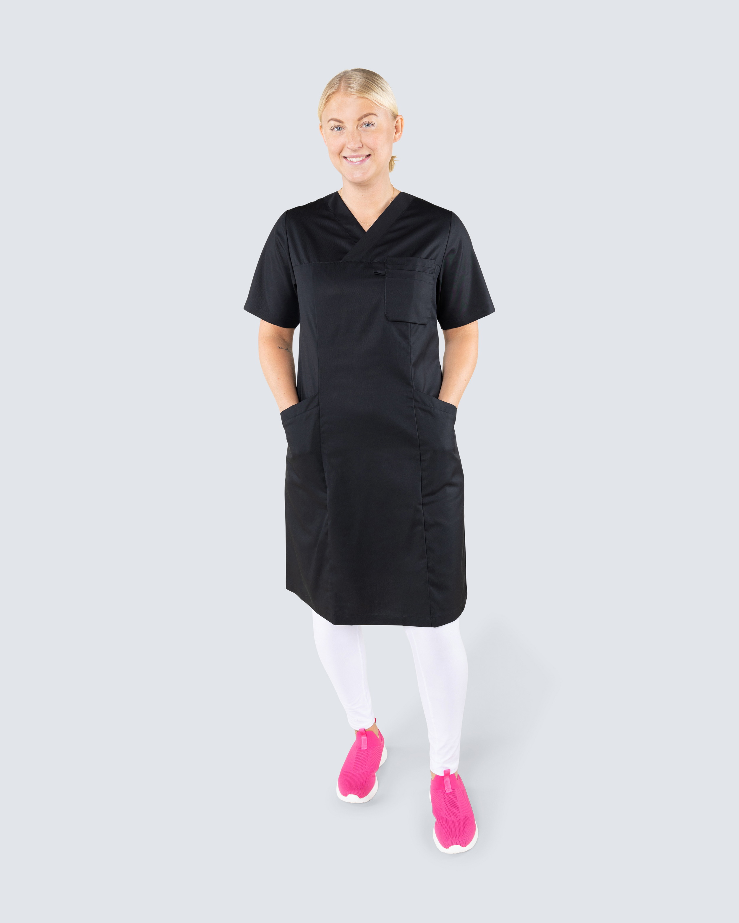 Komfortabel pleiekjole i miljøvennlig Tencel. Tencel er et materiale som gir en lett og behagelig følelse, puster godt og har høy komfort - perfekt for deg i helsevesenet med lange og varme arbeidsøkter. Arbeidskjolen har to romslige sidelommer og en brystlomme. V-hals og litt skreddersydd for en fin passform.