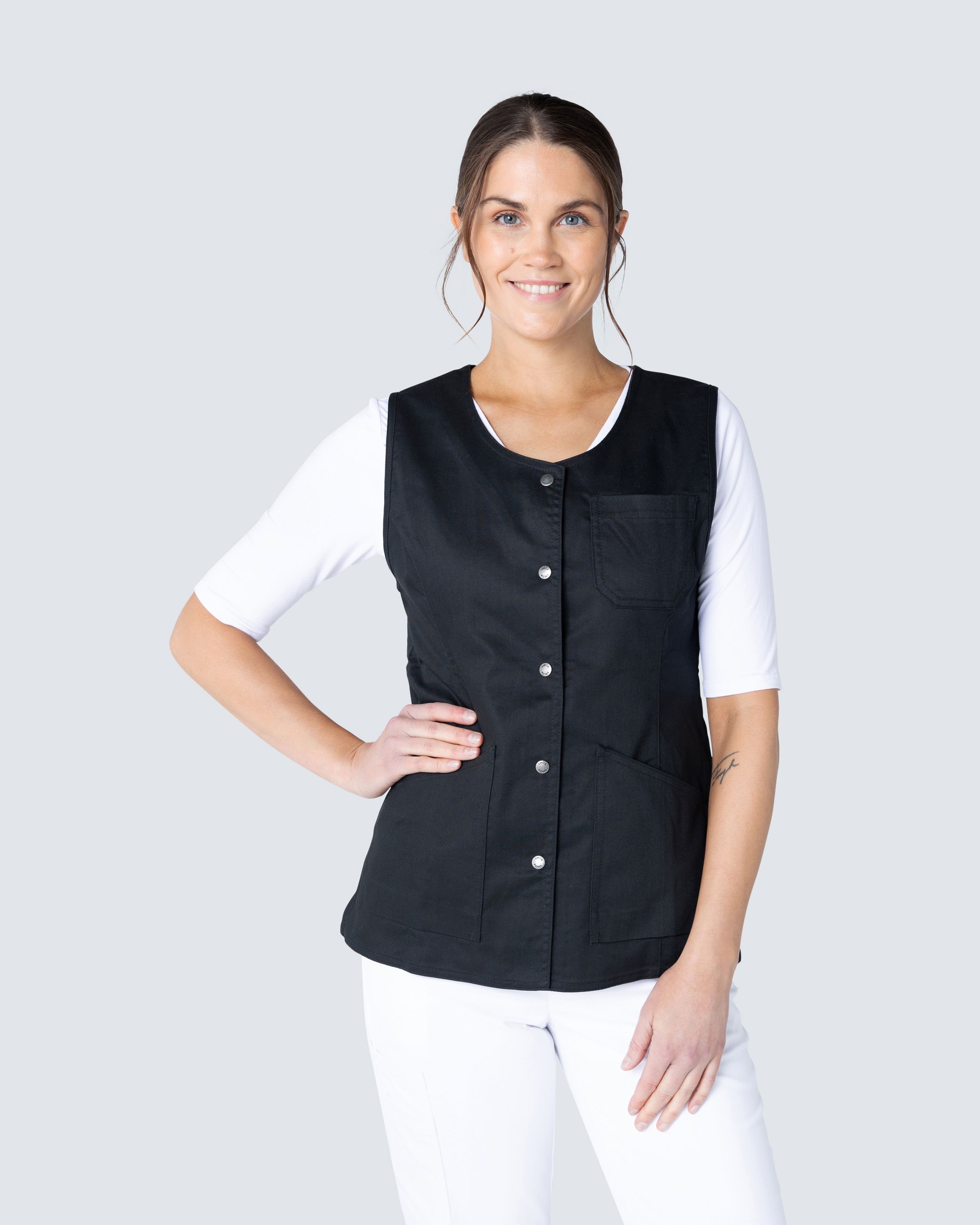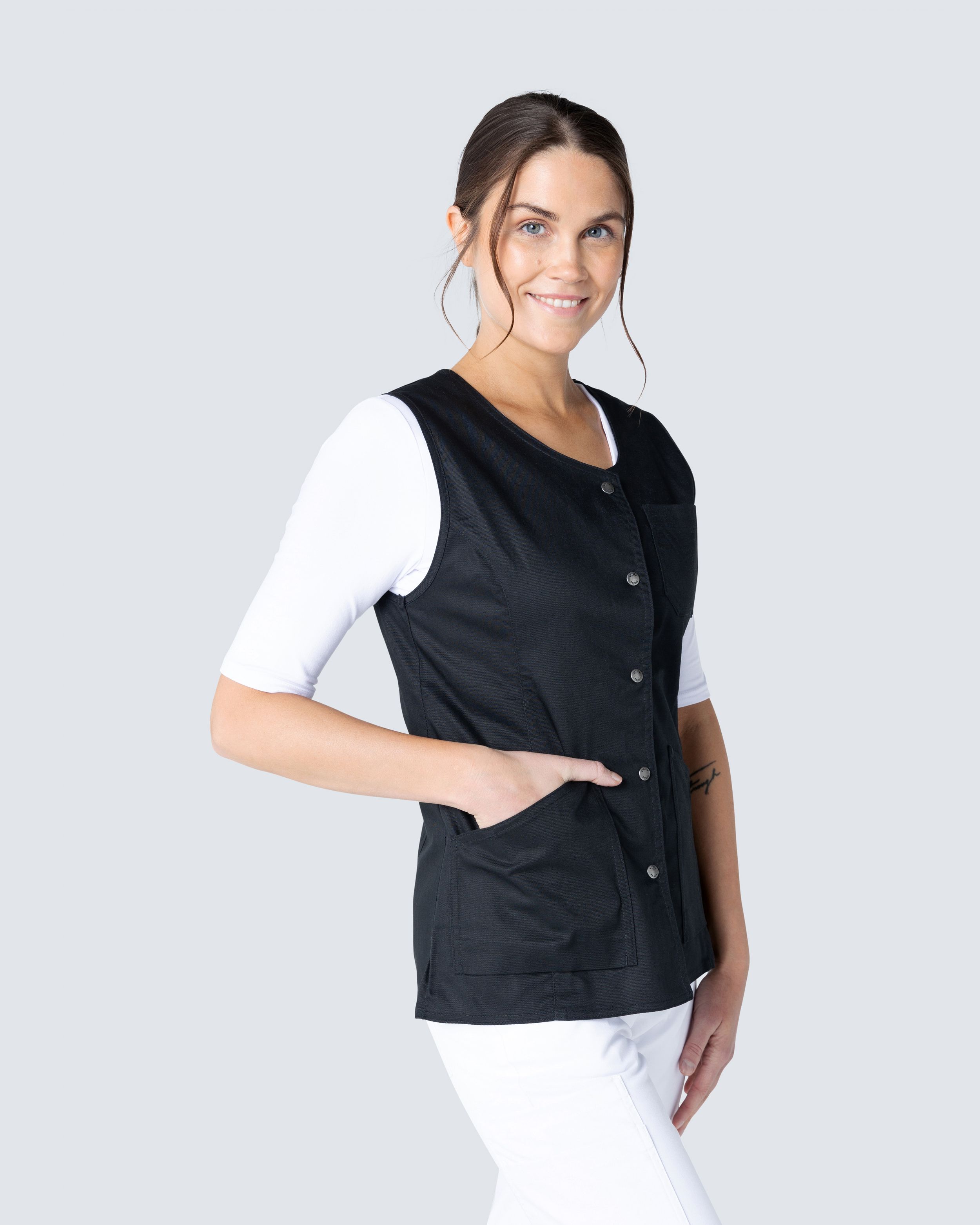 Denne arbeidsvesten fra South West har en lett innsvingt midje som gir en fin passform og silhuett. Vesten har romslige lommer, både en brystlomme og to skråstilte lommer foran. Med splitt i siden får du en god passform.