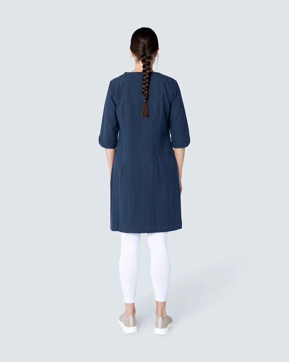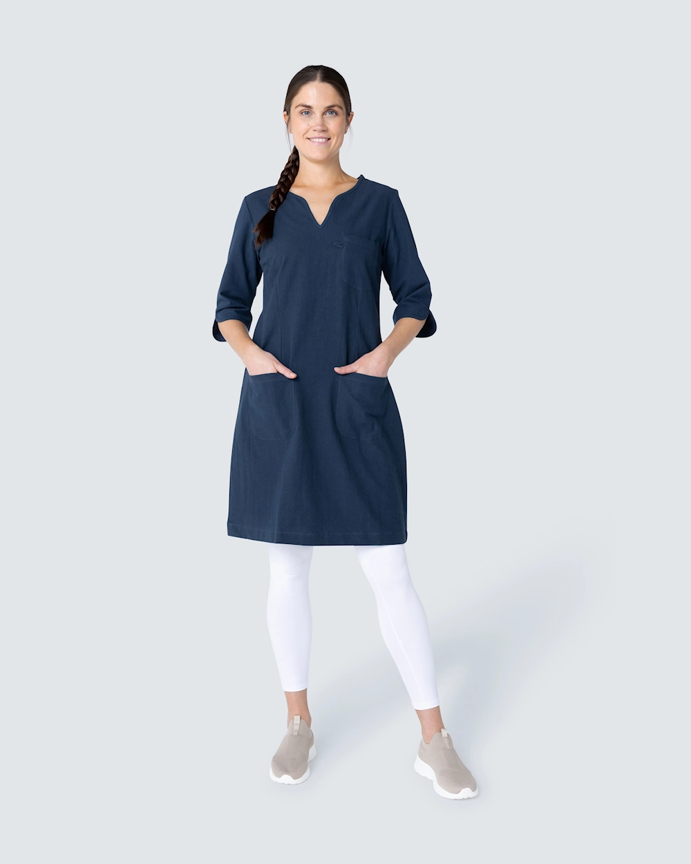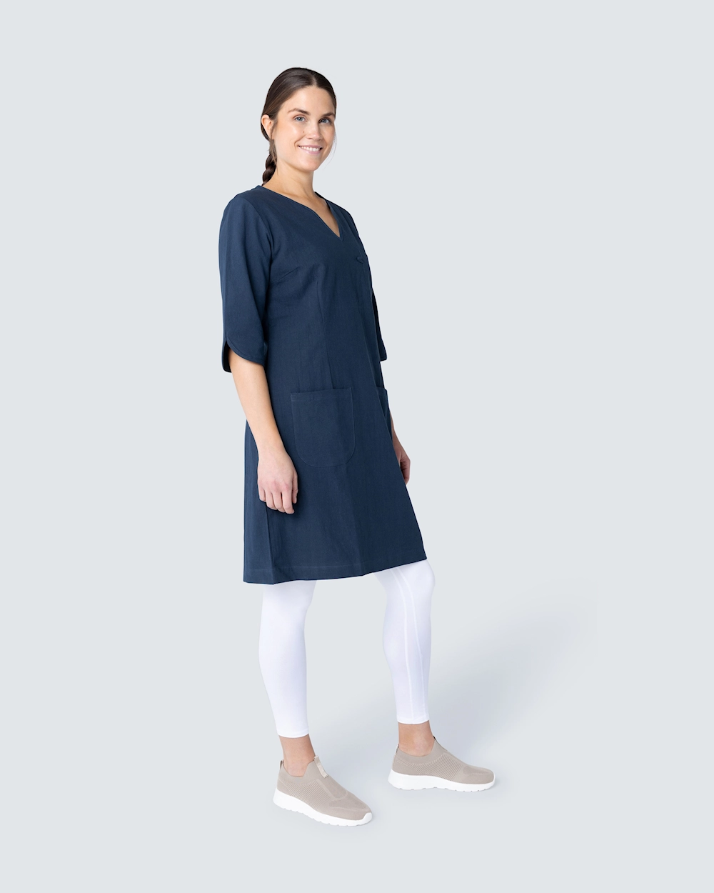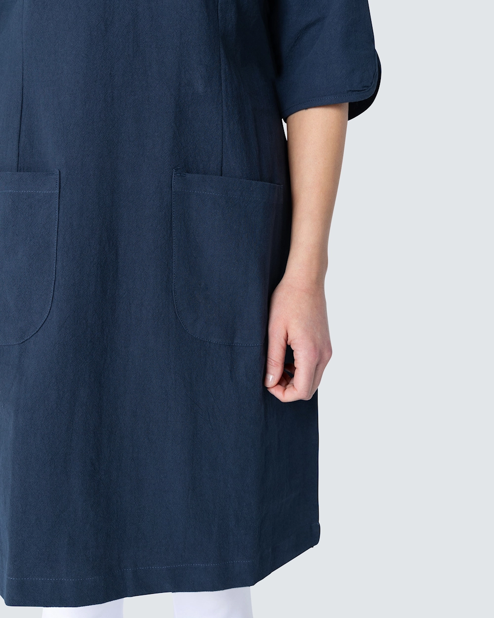 Kriklet kjole fra South West med båndkantet v-ringning. Plagget er sertifisert ifølge GOTS.