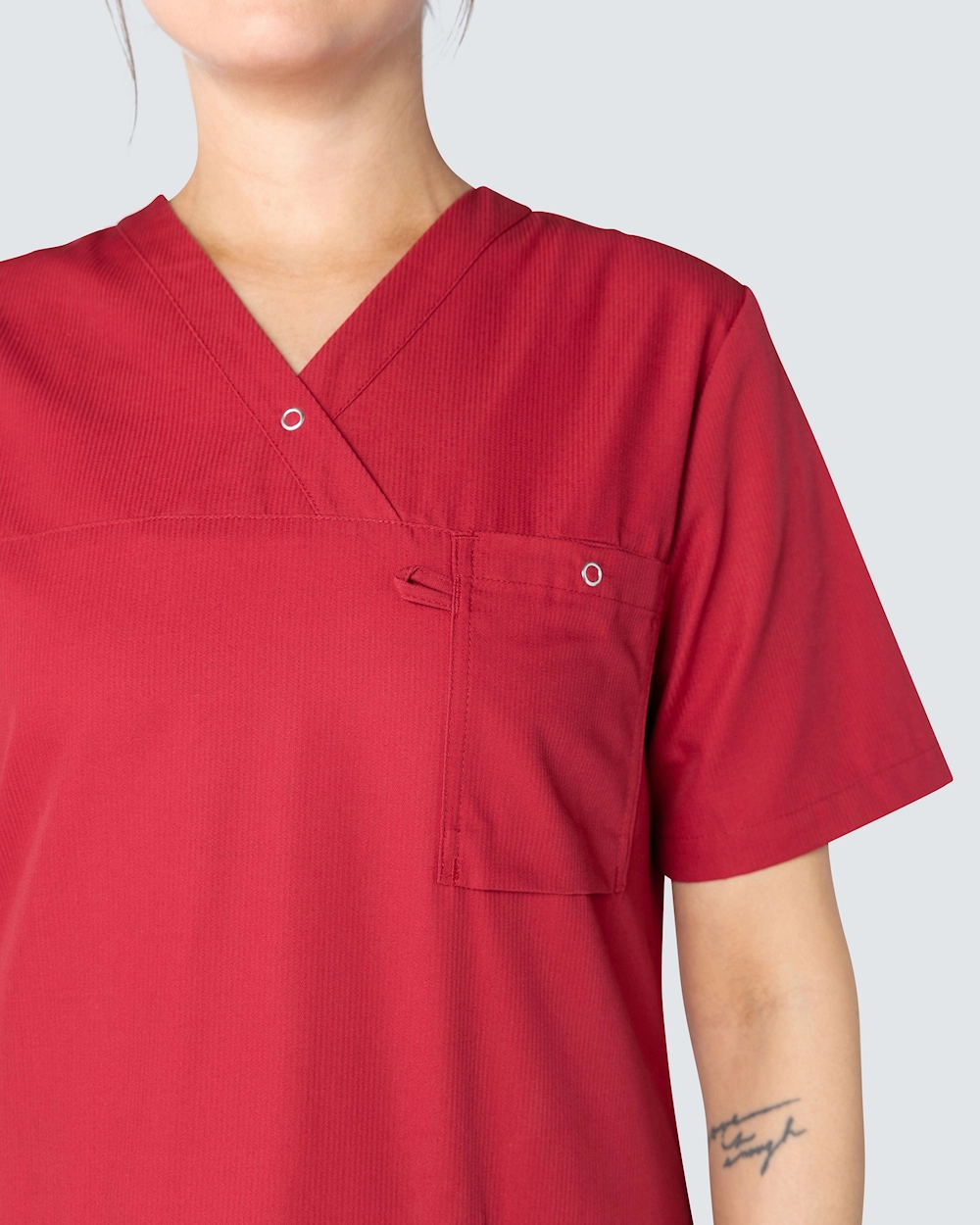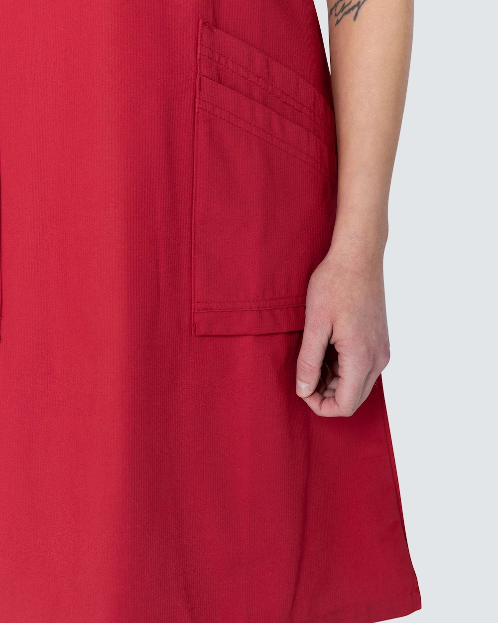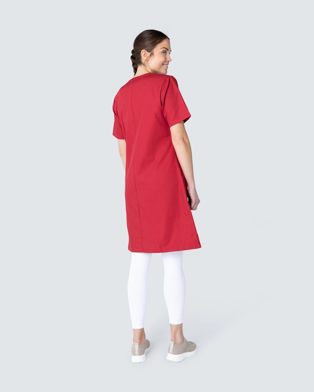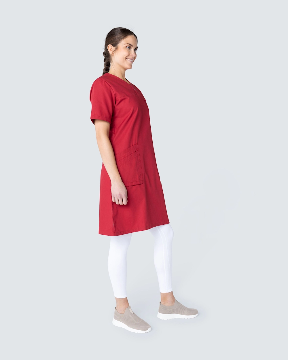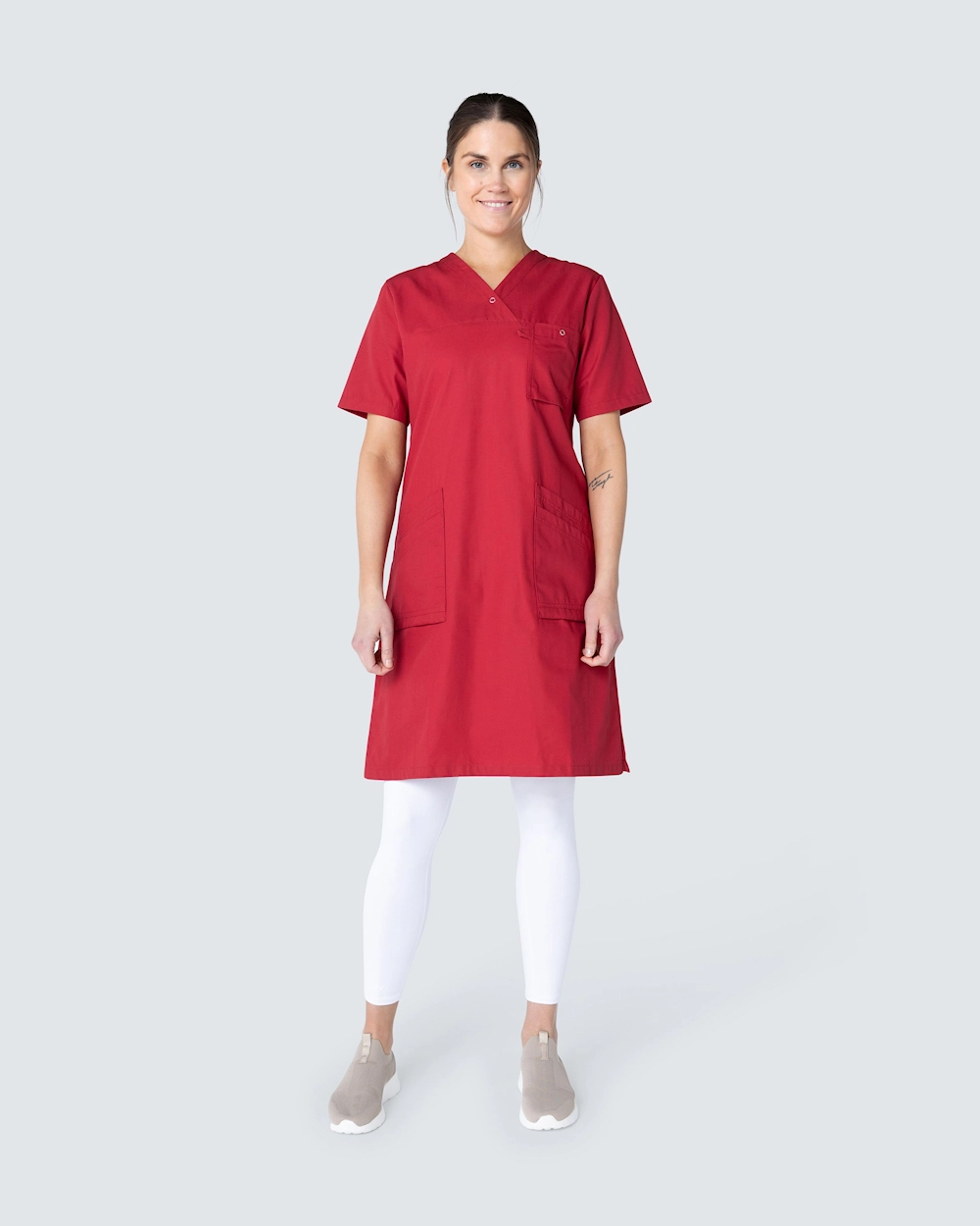 Lett figursydd arbeidskjole med dekorativ V-utringning. Knelang modell med to doble, skråstilte sidelommer som gir plass til diverse arbeidsredskaper og hjelpemidler. Kjolen har også en brystlomme med knapper og et praktisk nøkkelhull, samt splitter i siden for optimal bevegelsesfrihet gjennom arbeidsdagen.