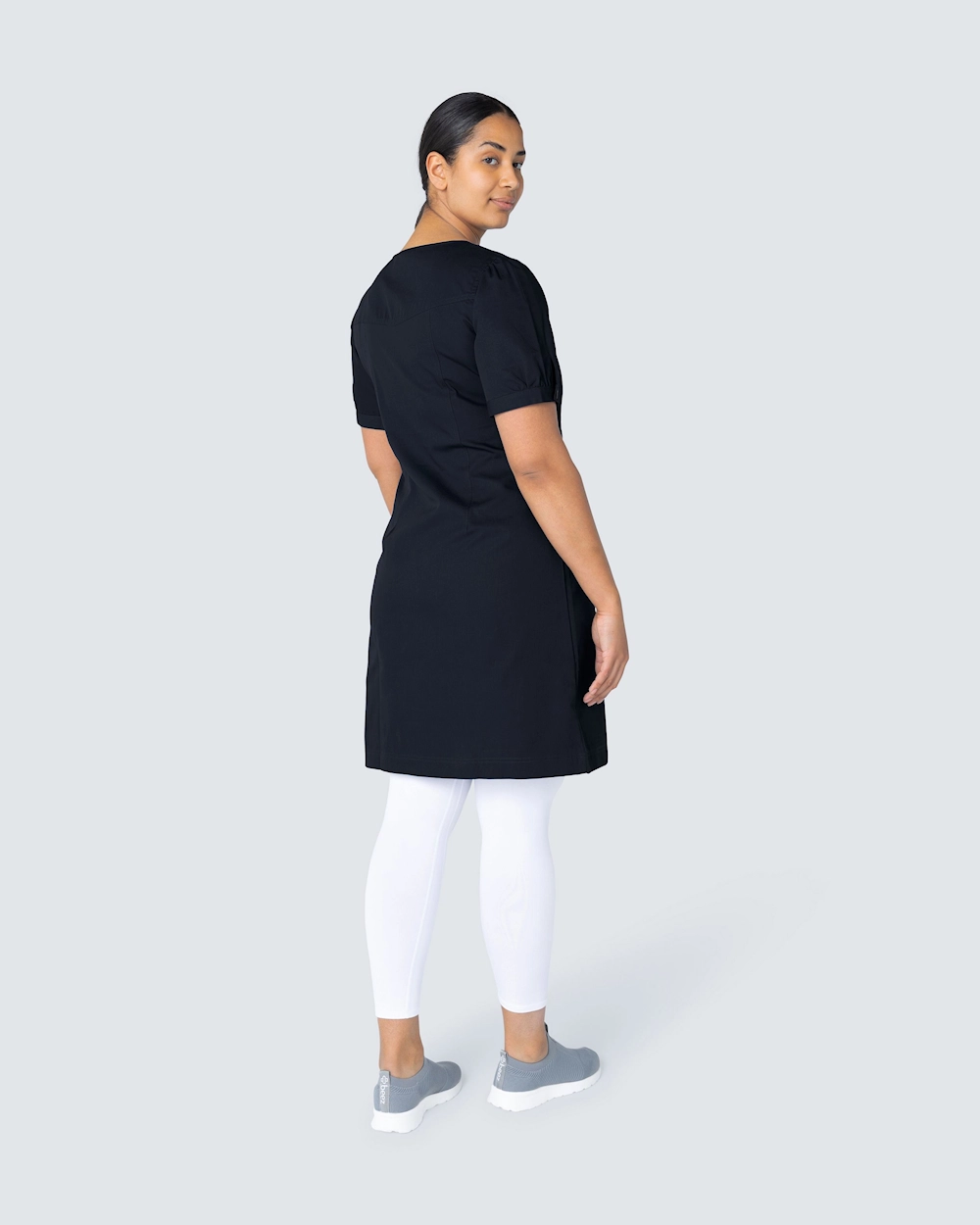 Detaljrik kjole med stikninger, knapper og rynk i overkant på lommene.