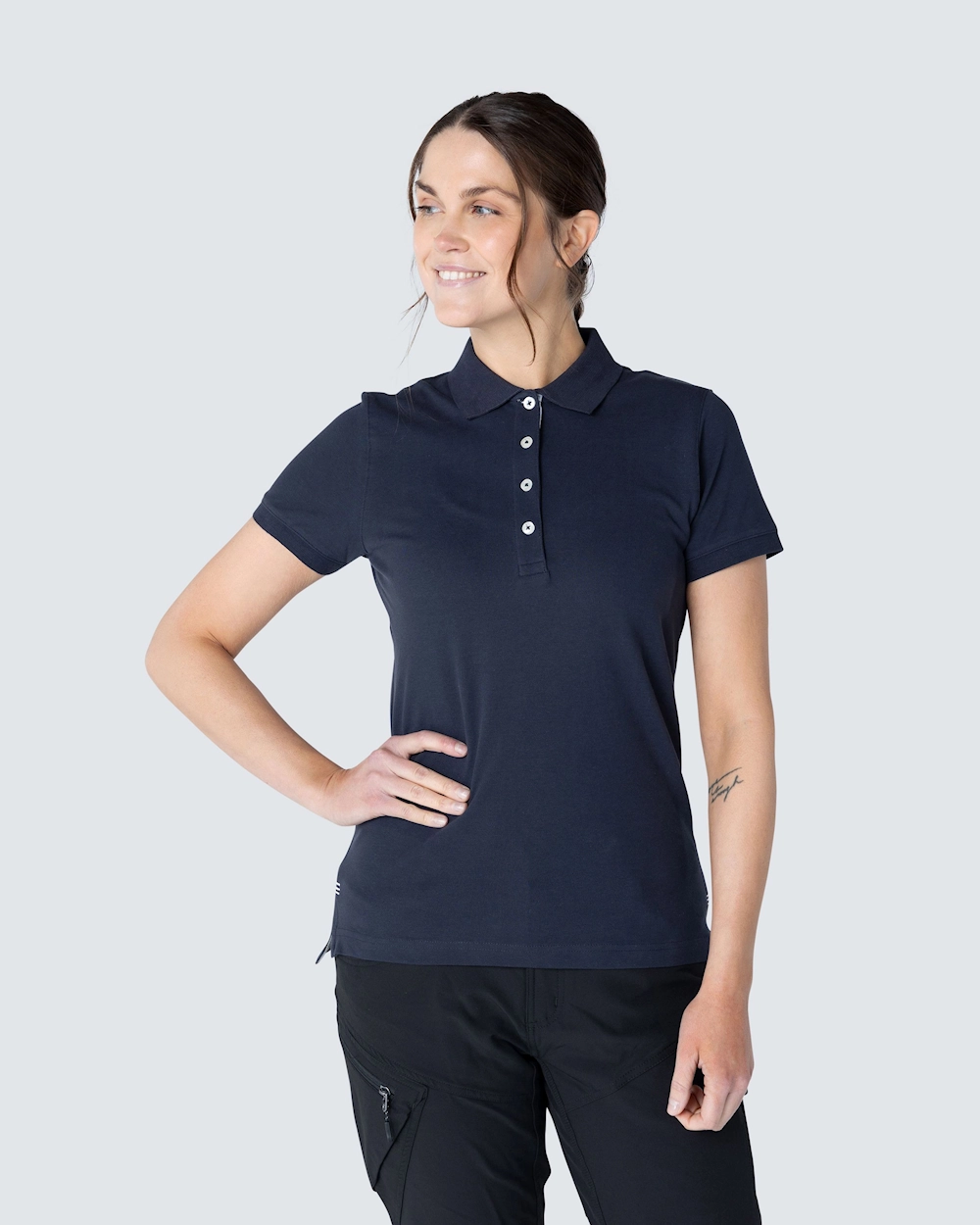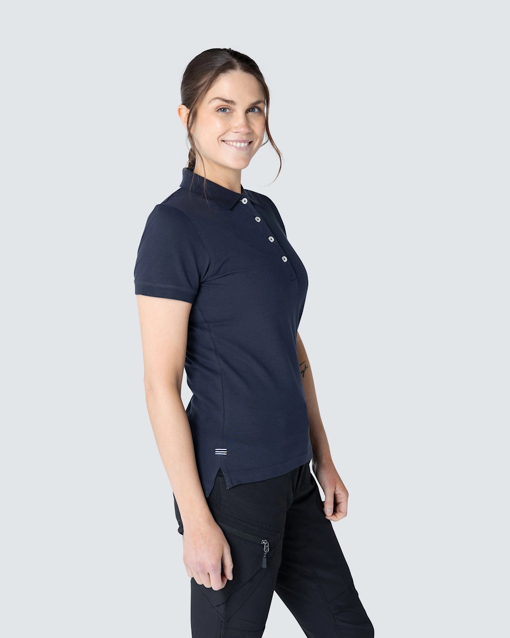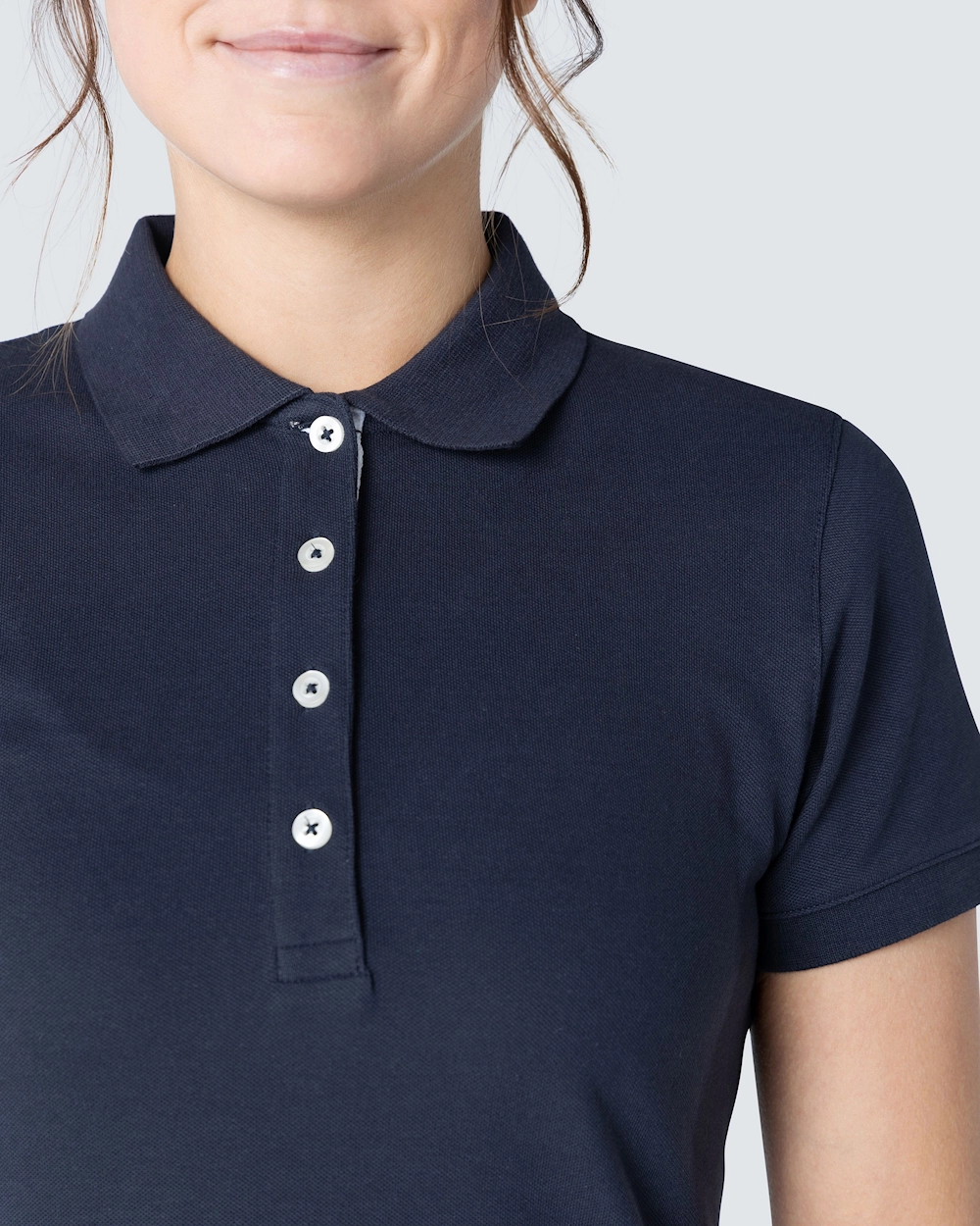 Piké med damepassform. Dekorative bånd i nakken og snittet. Halvmånsøm i nakken. Lengre knepping for et feminint utseende. Knepping med hvite knapper og fiskbensmønster på innsiden i en annen farge og en subtil brodert tone-i-ton. Broderte dyr i forskjellige farger over sprint.