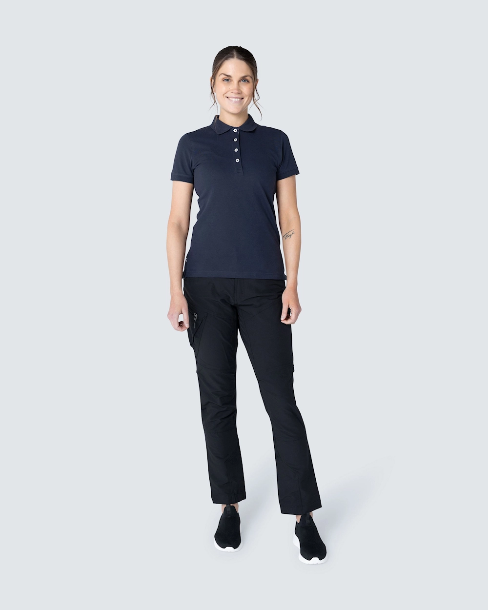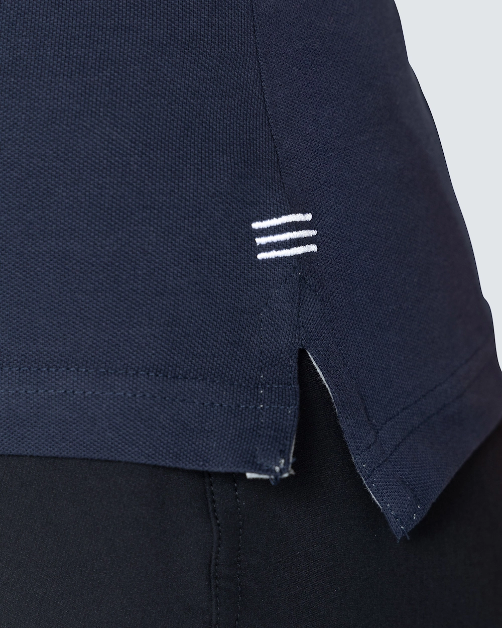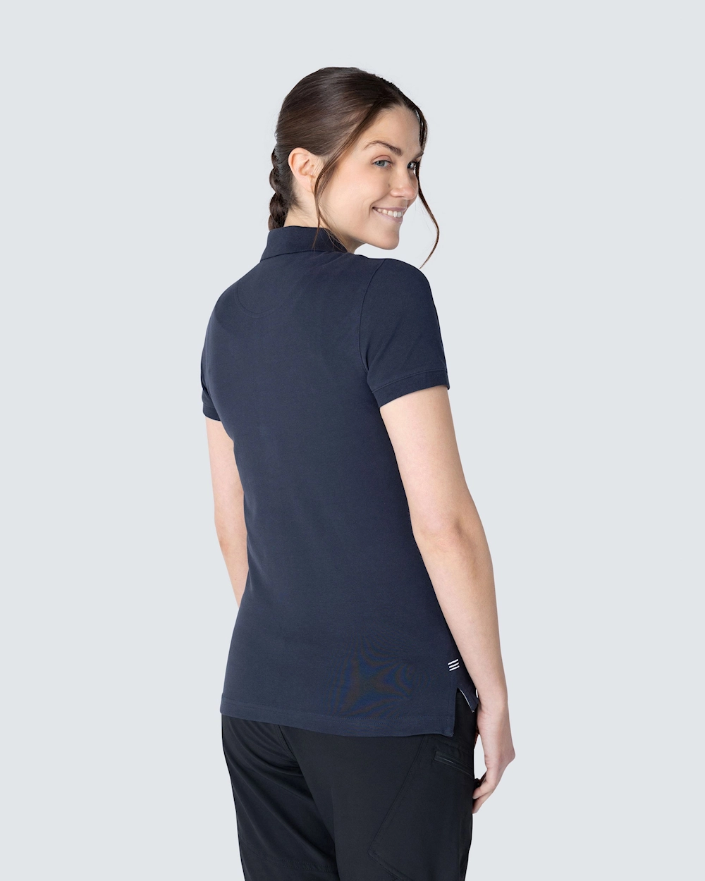 Piké med damepassform. Dekorative bånd i nakken og snittet. Halvmånsøm i nakken. Lengre knepping for et feminint utseende. Knepping med hvite knapper og fiskbensmønster på innsiden i en annen farge og en subtil brodert tone-i-ton. Broderte dyr i forskjellige farger over sprint.