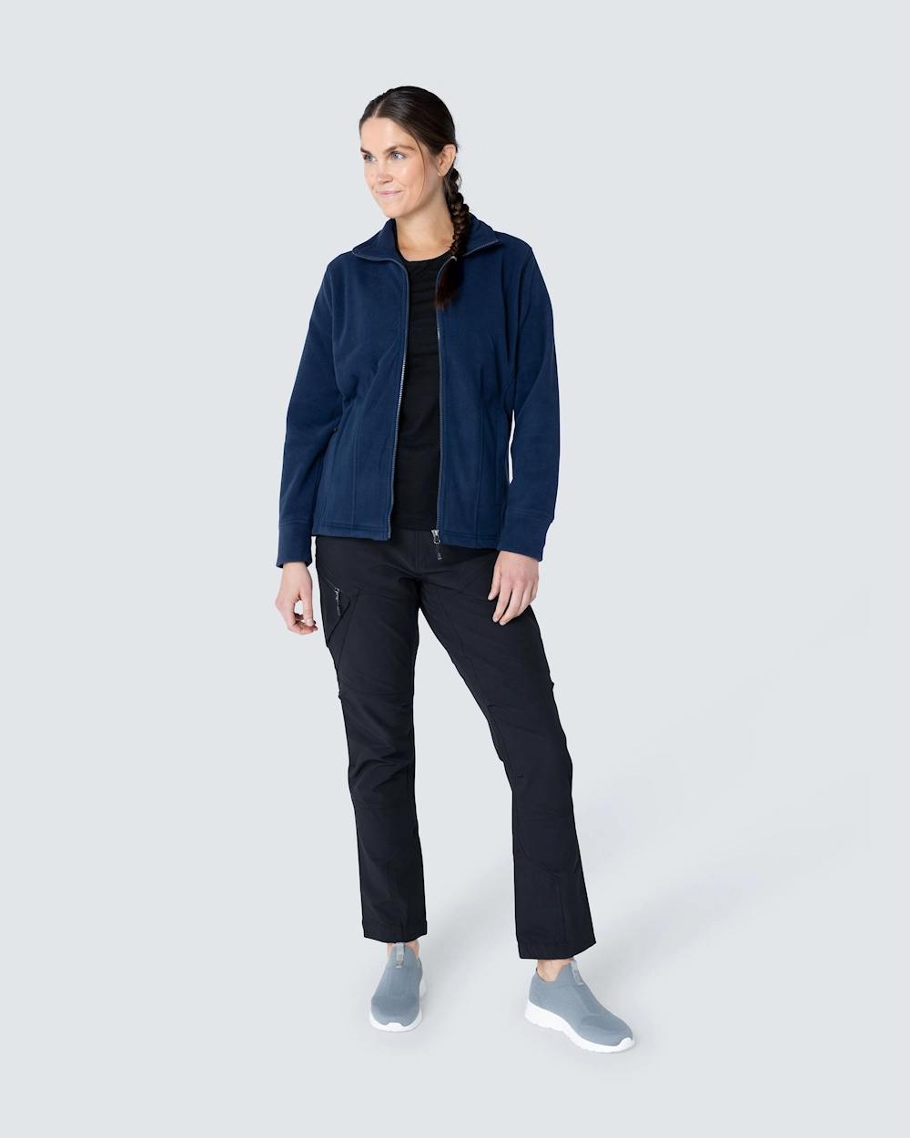 Fleecejakke i figursydd damepassform. Justrebar midje. To lommer med glidelås. Anti-pilling behandlet.