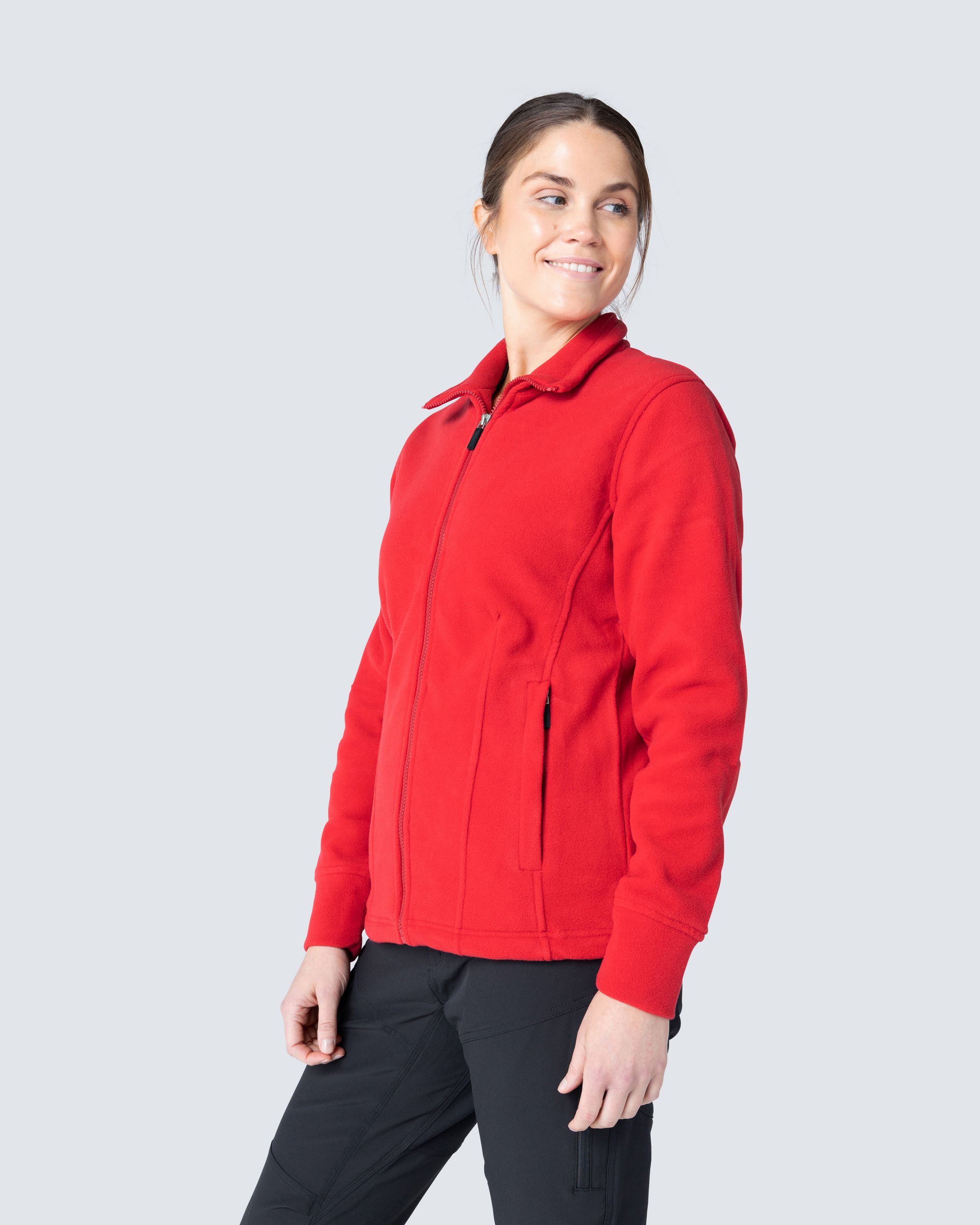 Fleecejakke i figursydd damepassform. Justrebar midje. To lommer med glidelås. Anti-pilling behandlet.