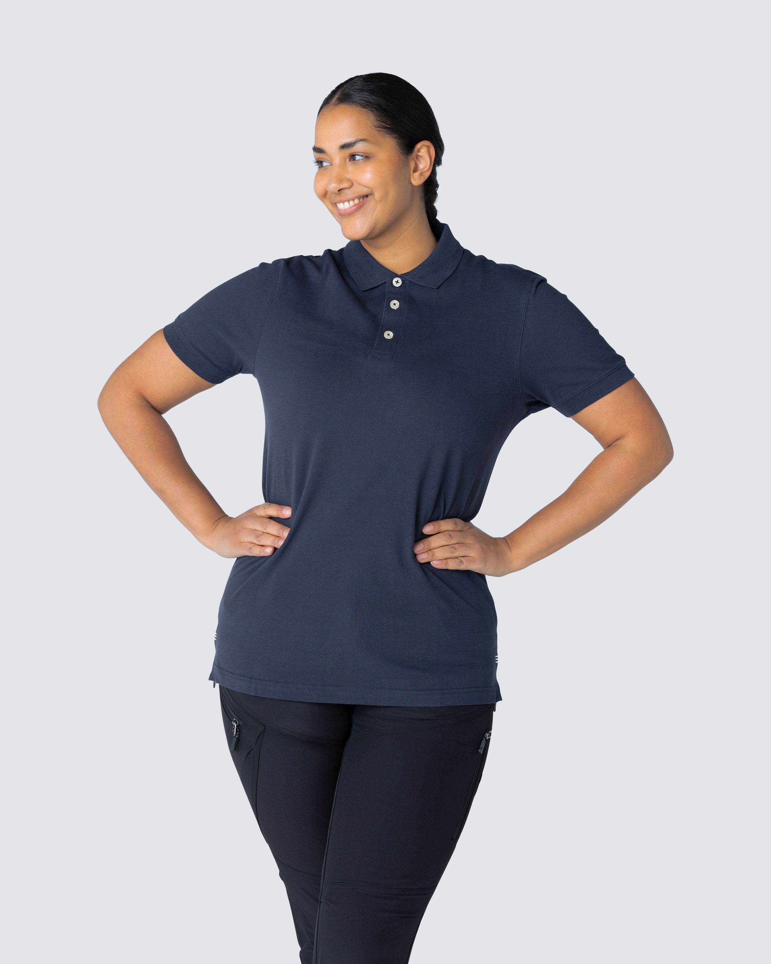 Piké med knappestolpe i kontrasterende farge og hvite knapper. Forsterkede sømmer. Kontrastfarge i nakke og brodert ved splitt. Ribbestrikket krave og mansjetter.