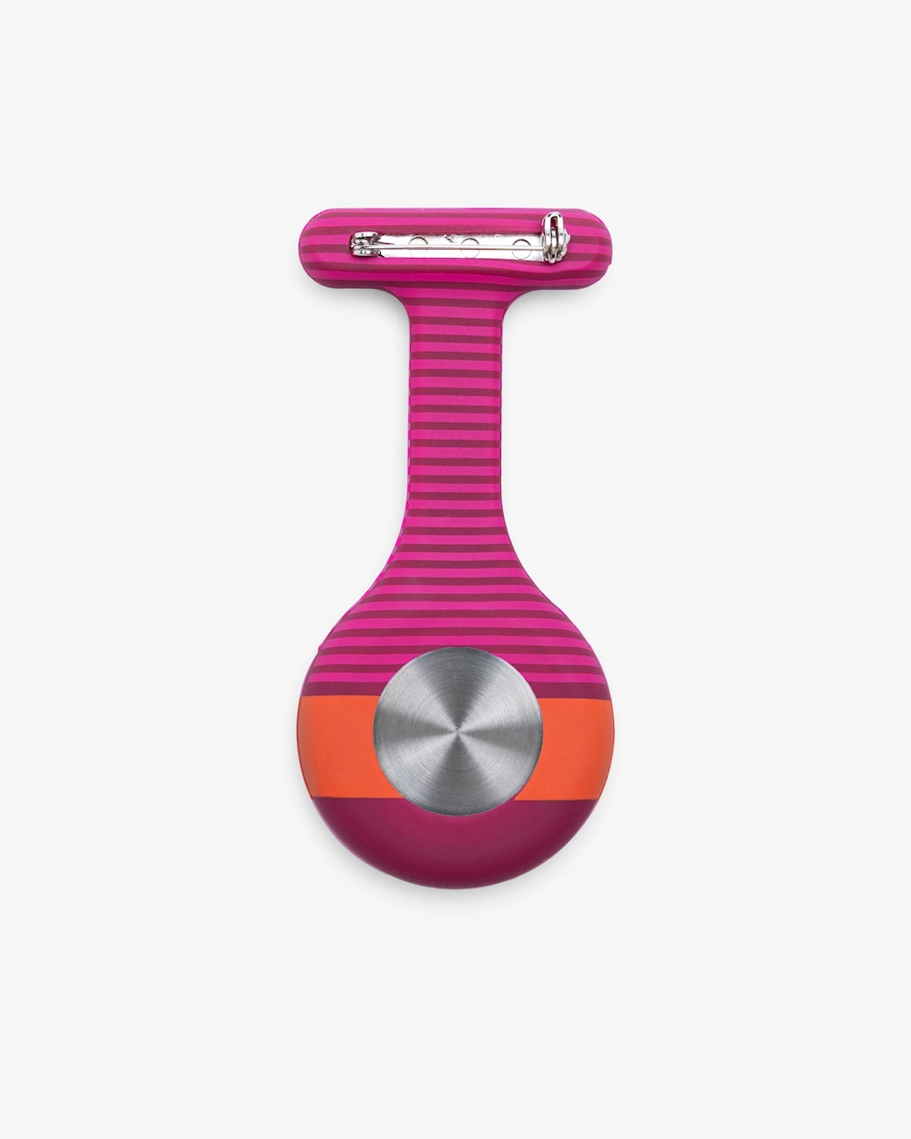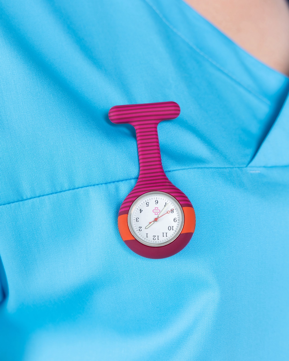 Sykepleierklokken festes enkelt på ønsket plagg med hjelp av en sikkerhetsnål. Klokkens skall er i silikon, noe som gjør det til en perfekt og hygenisk alternativ for deg som jobber i helsetjenesten.