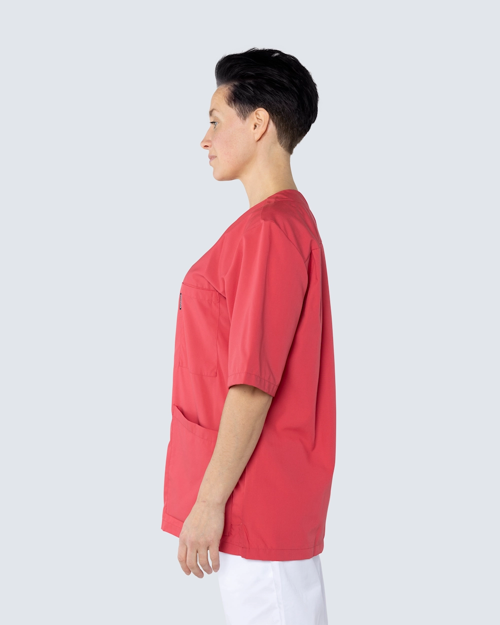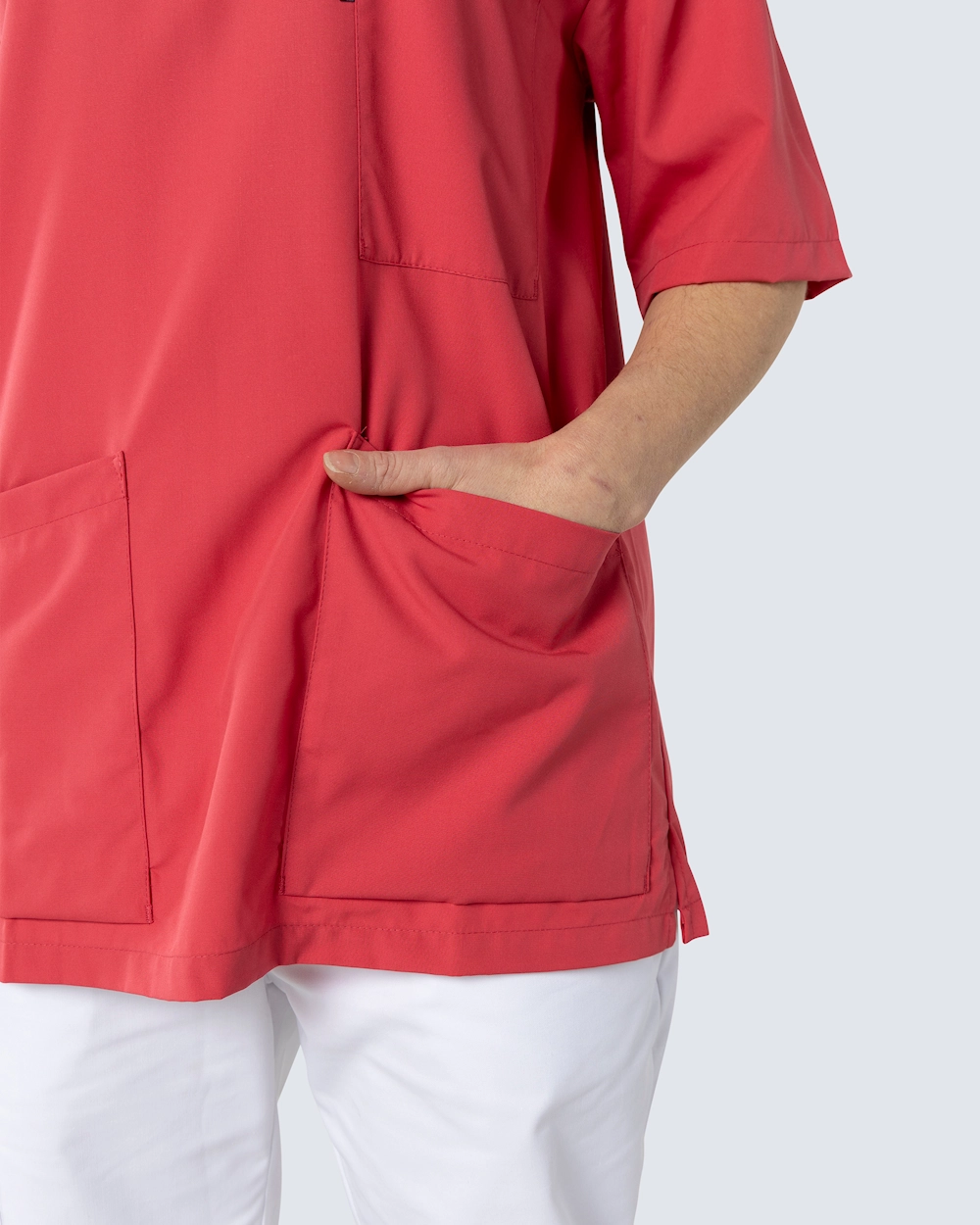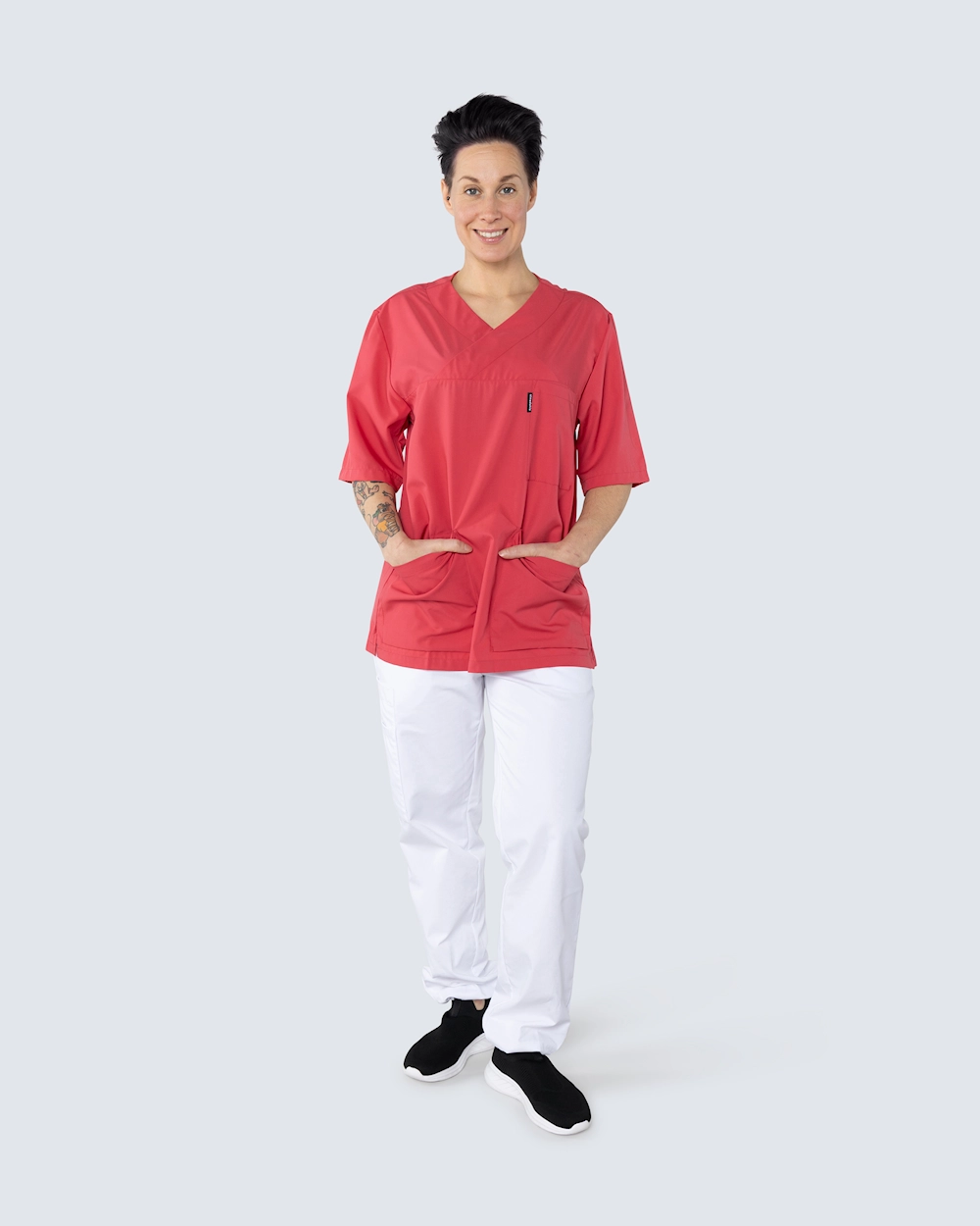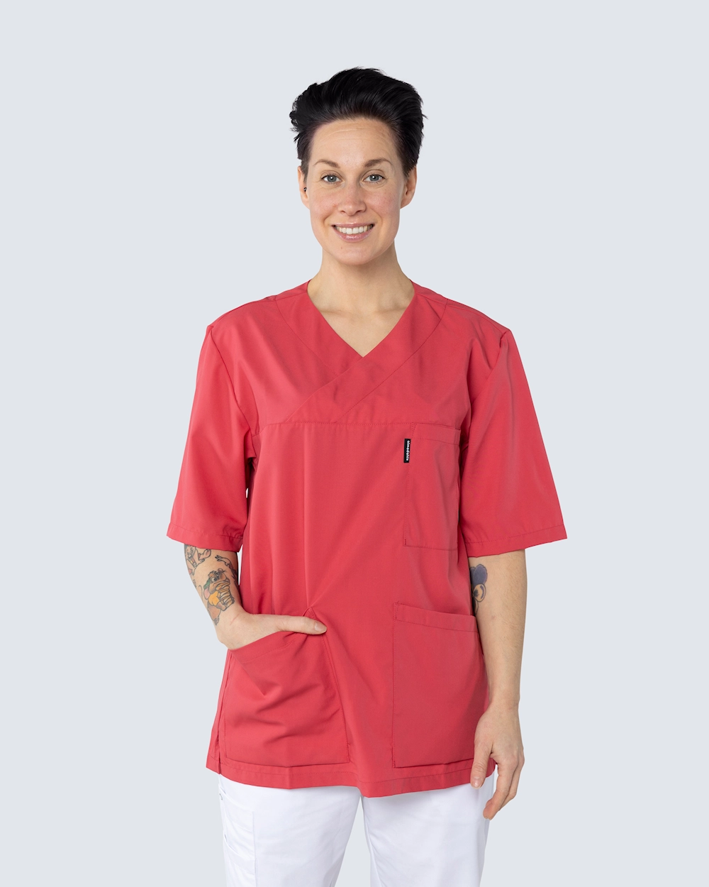 Denne blusen er laget av en Tencel / polyester-blanding som gir et mykt og behagelig plagg som er holdbart og fargebestandig. Tencelle lar plagget puste og transportere fukt, slik at du kan holde deg sval og behagelig under lange arbeidsøkter. Blusen har brystlomme og romslige hoftelommer og god bevegelsesfrihet. Takket være både splitt og ryggfold får du en behagelig og praktisk arbeidsbluse.